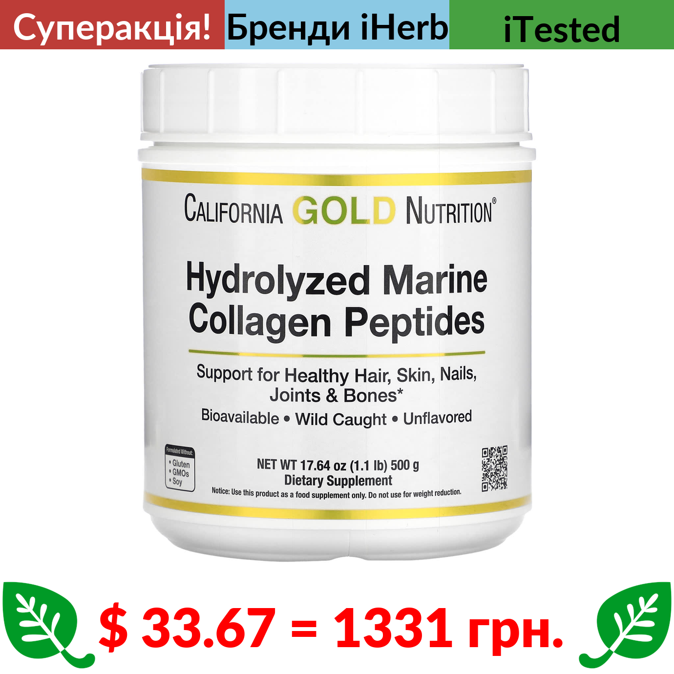 $ 33.67 = 1331 грн. ???? cуперакція! ???? California Gold Nutrition, гідролізовані пептиди морського колагену, без добавок, 500 г (17,64 унції)