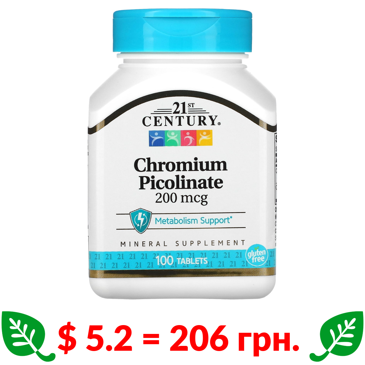 $ 5.2 = 206 грн. 21st Century, піколінат хрому, 200 мкг, 100 таблеток
