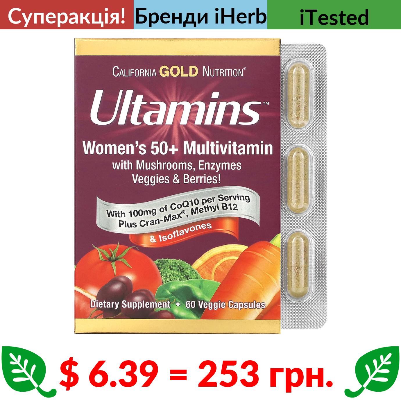 $ 6.39 = 253 грн. ???? cуперакція! ???? California Gold Nutrition, Ultamins, мультивітаміни для жінок старше 50 років із коензимом Q10, гриби, ферменти, овочі та ягоди, 60 вегетаріанських капсул