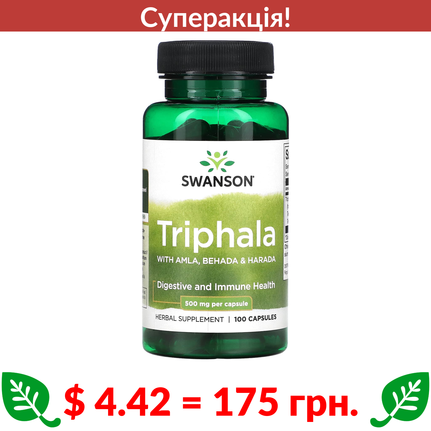 $ 4.42 = 175 грн. ???? cуперакція! ???? Swanson, трифала з амлою, бібхітакі й міробаланом, 500 мг, 100 капсул