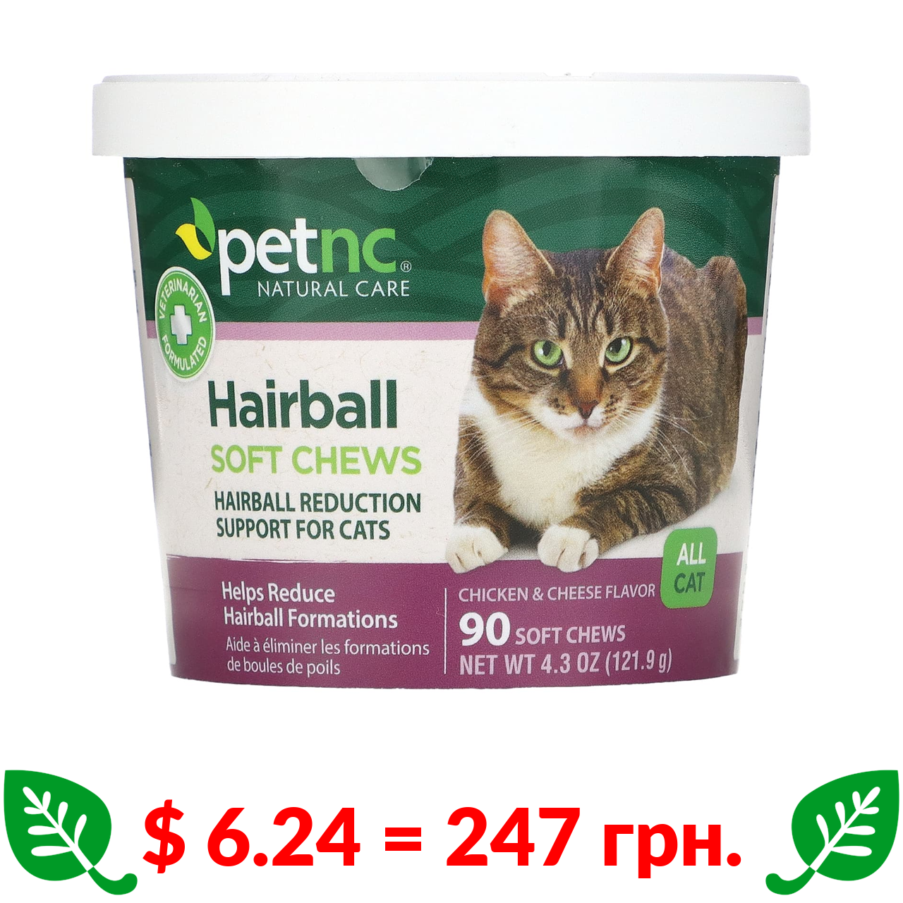 $ 6.24 = 247 грн. petnc NATURAL CARE, м’які жувальні таблетки для захисту від утворення грудок шерсті, для всіх кішок, зі смаком курки та сиру, 90 шт.