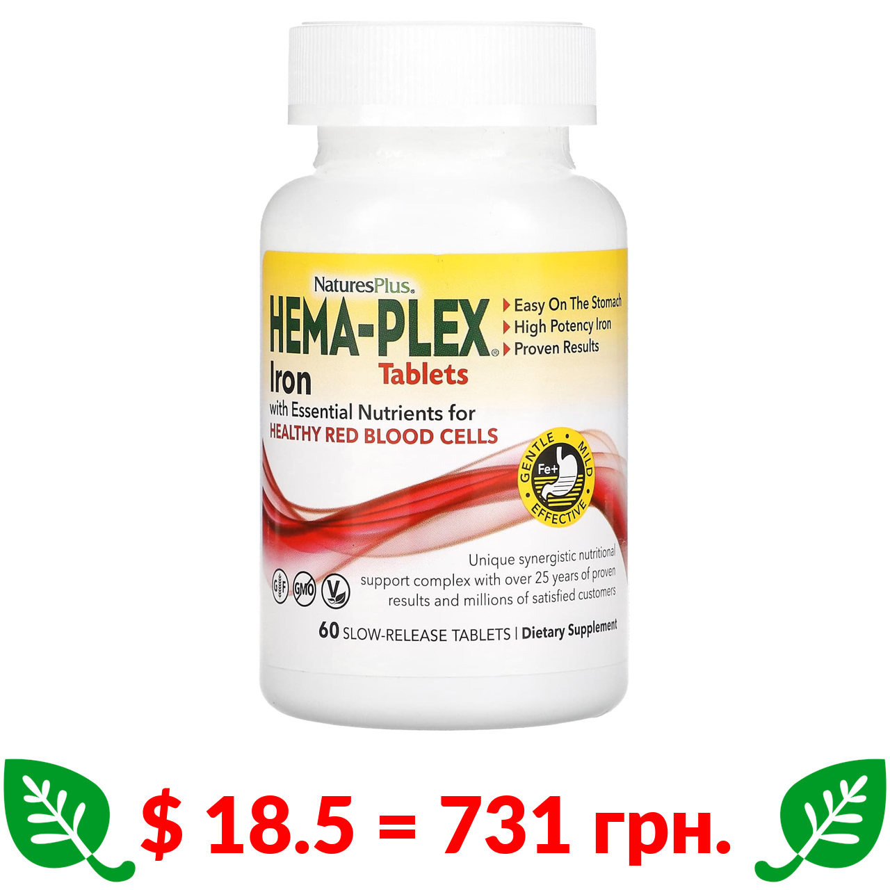 $ 18.5 = 731 грн. Nature’s Plus, Hema-Plex, залізо з необхідними поживними речовинами для здоров’я еритроцитів, 60 таблеток із повільним вивільненням
