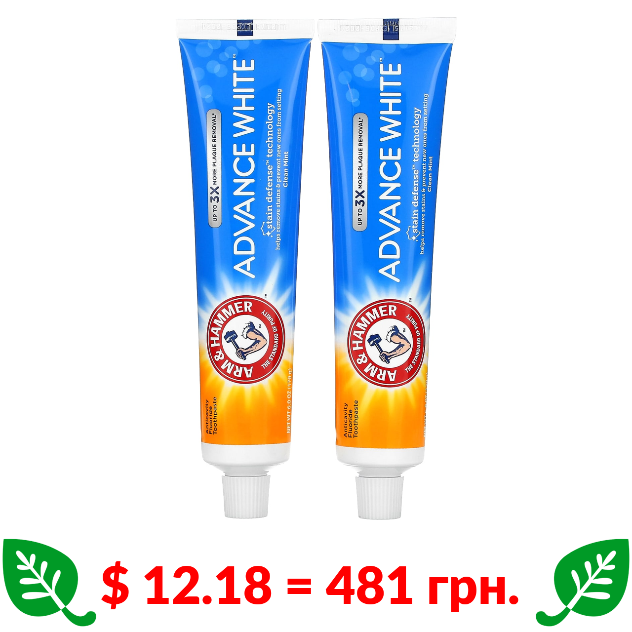 $ 12.18 = 481 грн. Arm & Hammer, AdvanceWhite, відбілююча зубна паста підвищеної ефективності, м’ята, подвійна упаковка, 170 г (6,0 унцій) кожна