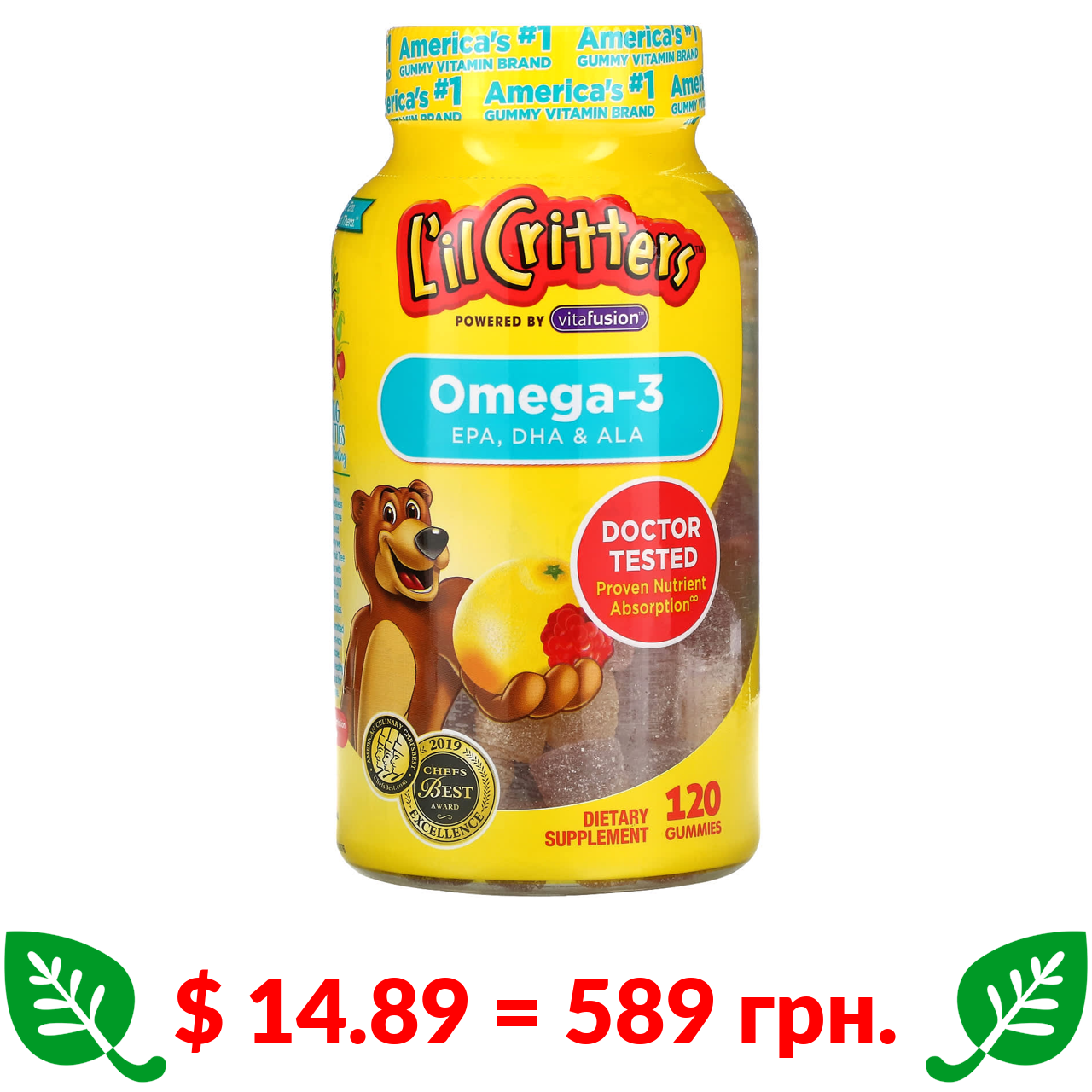 $ 14.89 = 589 грн. L’il Critters, омега-3, зі смаком малини та лимонаду, 120 жувальних цукерок