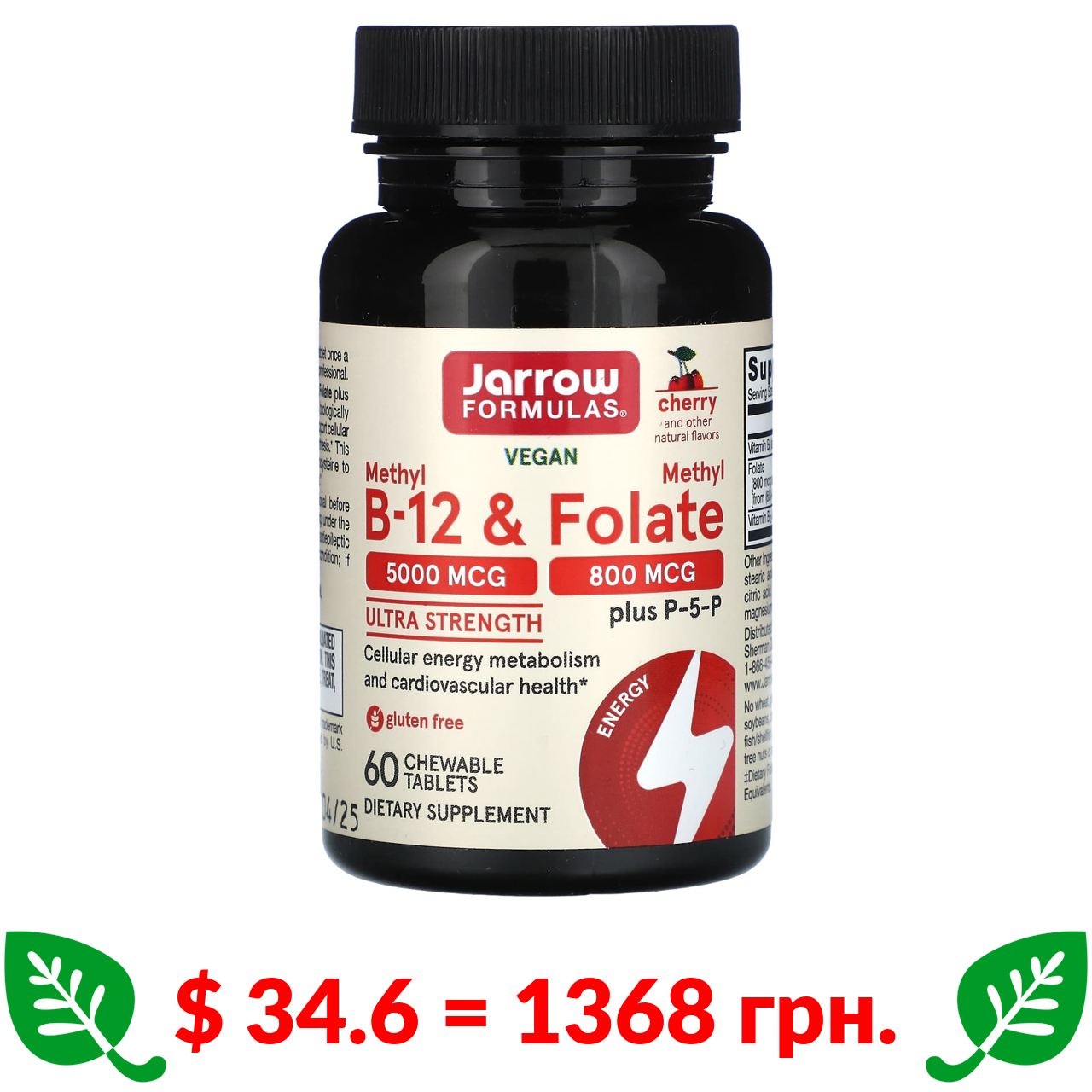 $ 34.6 = 1368 грн. Jarrow Formulas, веганський метил B12 і метилфолат, підсилена дія, вишня, 60 жувальних таблеток