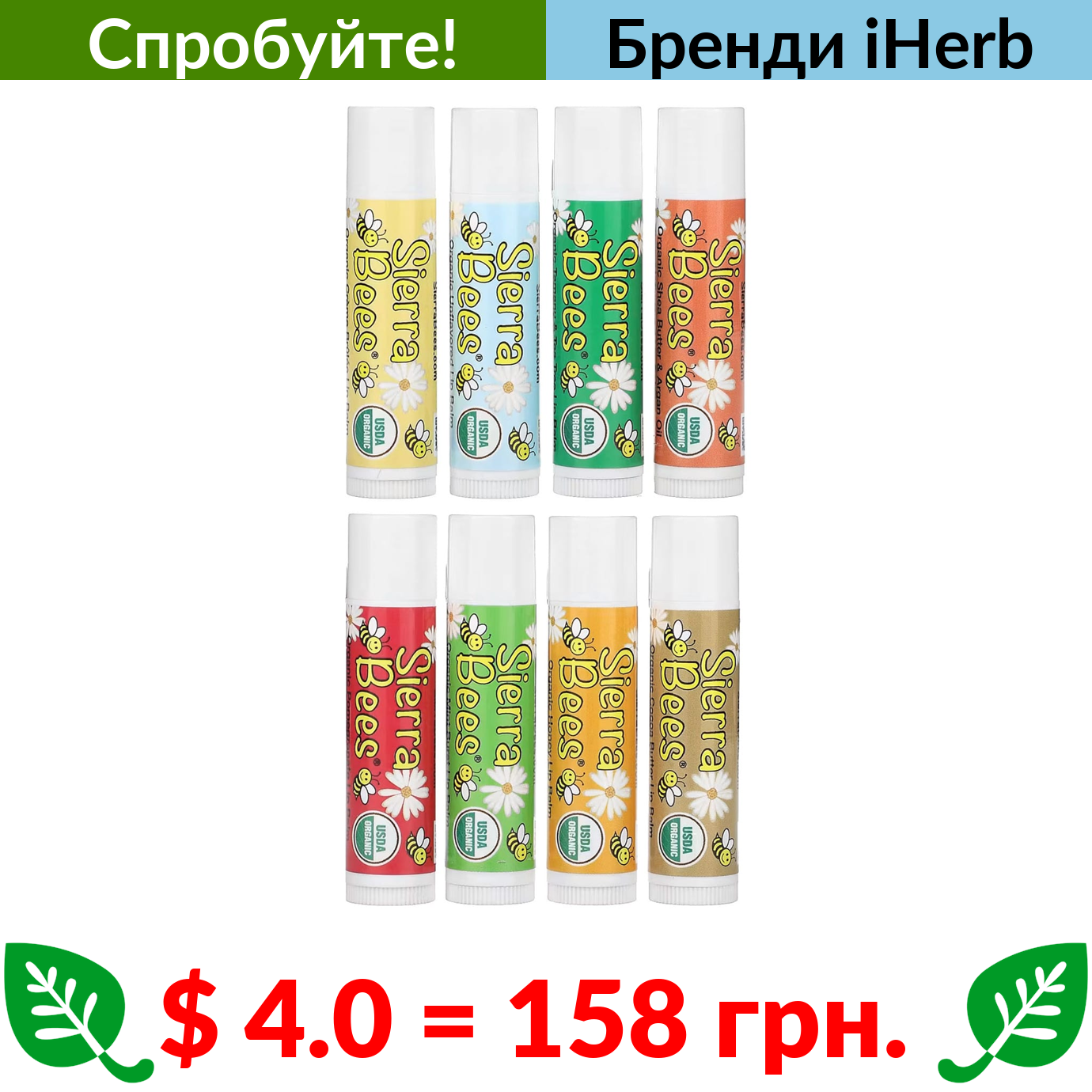 $ 4.0 = 158 грн. ???? варто спробувати ???? Sierra Bees, набір органічних бальзамів для губ, 8 шт,. по 4,25 г (0,15 унції)