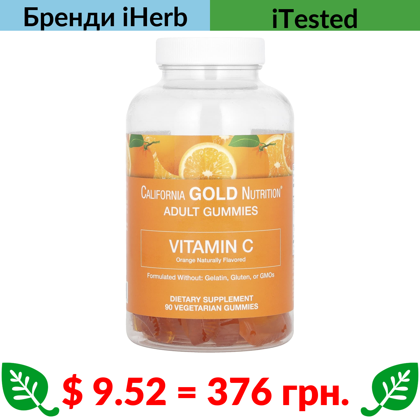 $ 9.52 = 376 грн. ????️ у кошику ????️ California Gold Nutrition, жувальні мармеладки з вітаміном C, зі смаком натурального апельсину, без желатину, 90 жувальних мармеладок