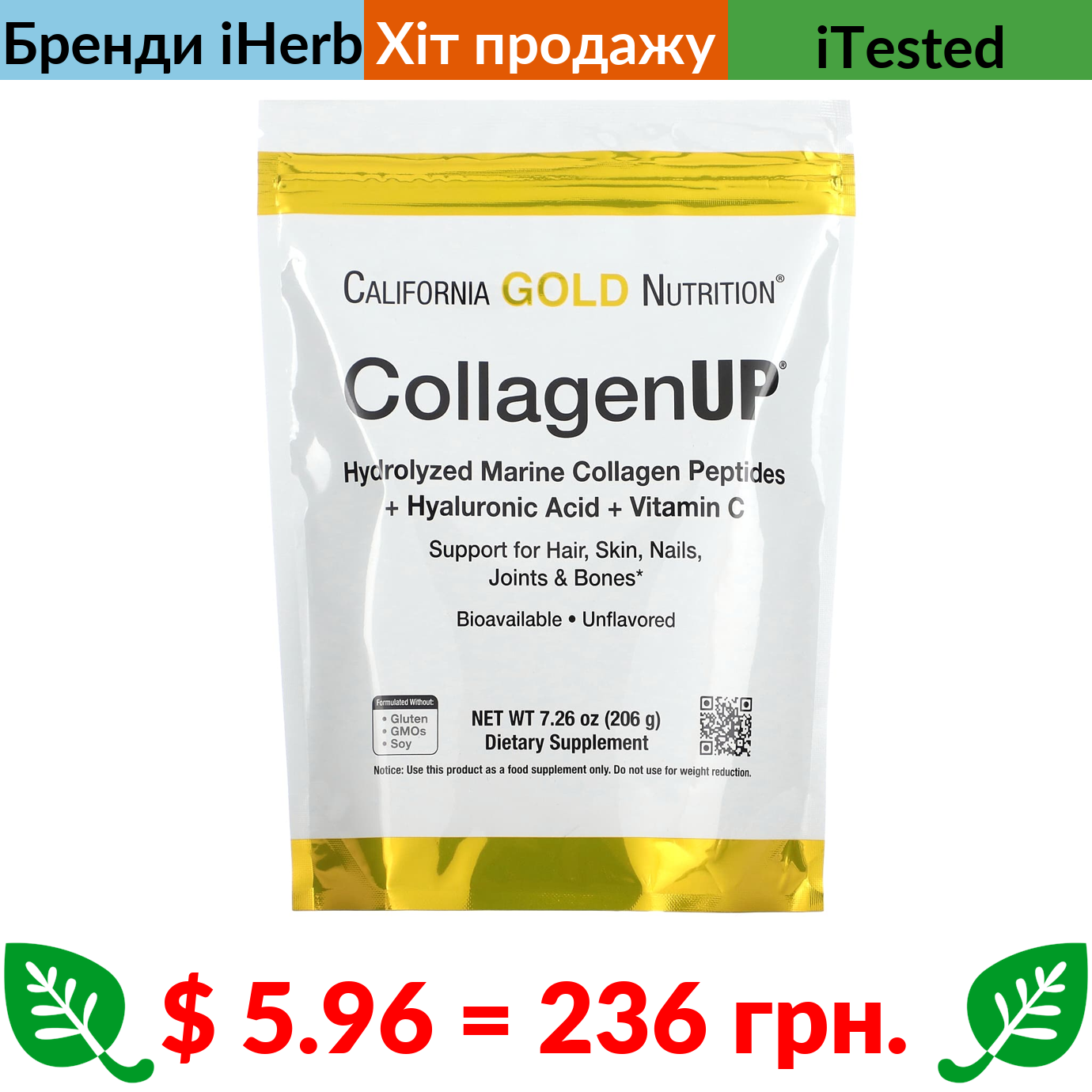 $ 5.96 = 236 грн. ???? cуперакція! ???? California Gold Nutrition, CollagenUP, пептиди гідролізованого морського колагену з гіалуроновою кислотою та вітаміном C, без добавок, 206 г (7,26 фунта)