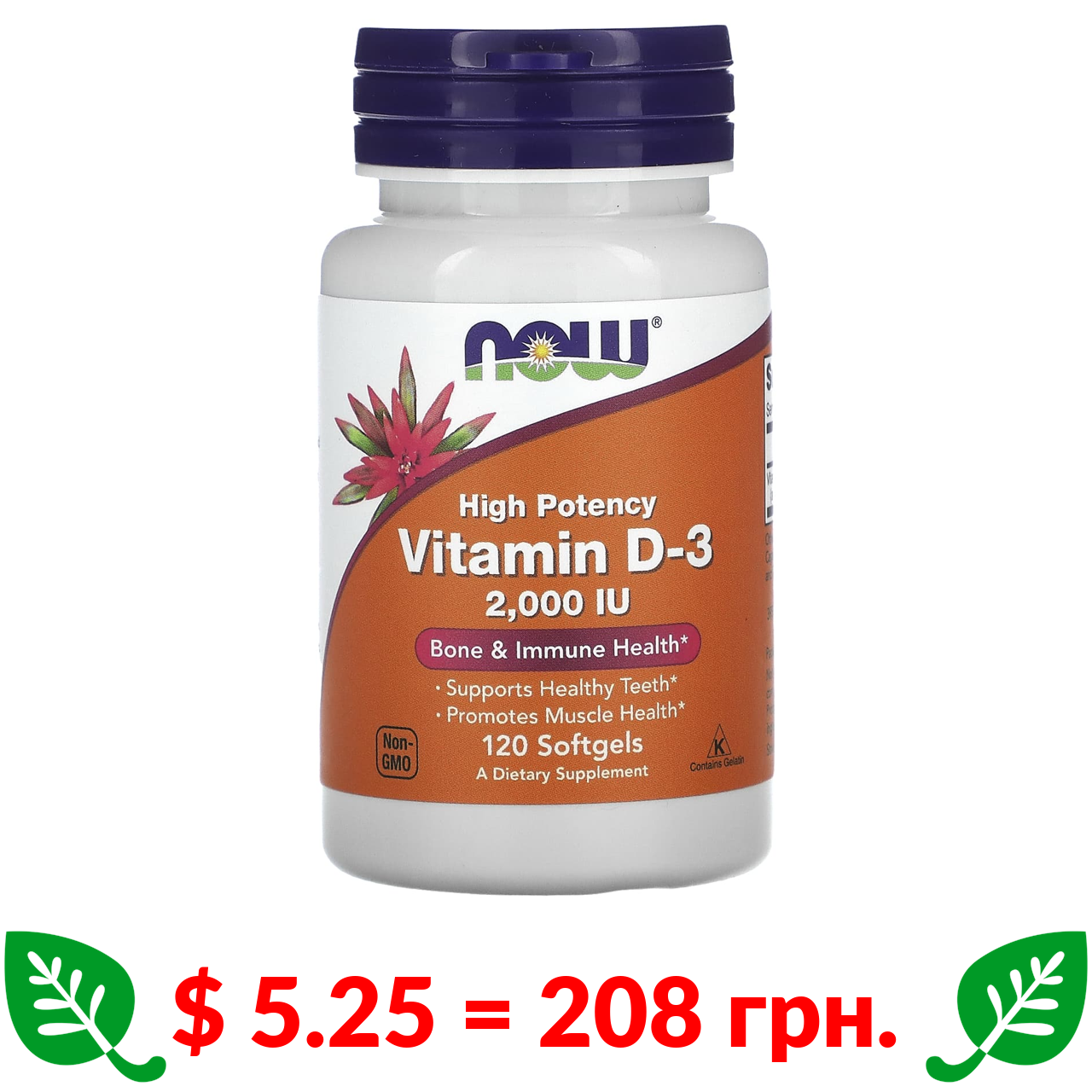 $ 5.25 = 208 грн. Now Foods, високоефективний вітамін D3, 50 мкг (2000 МО), 120 капсул