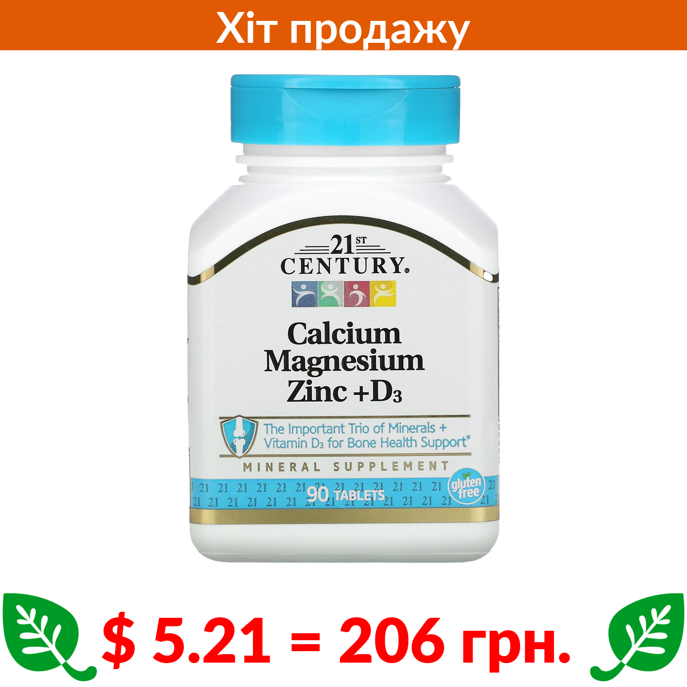 $ 5.21 = 206 грн. 21st Century, кальцій, магній, цинк і вітамін D3, 90 таблеток