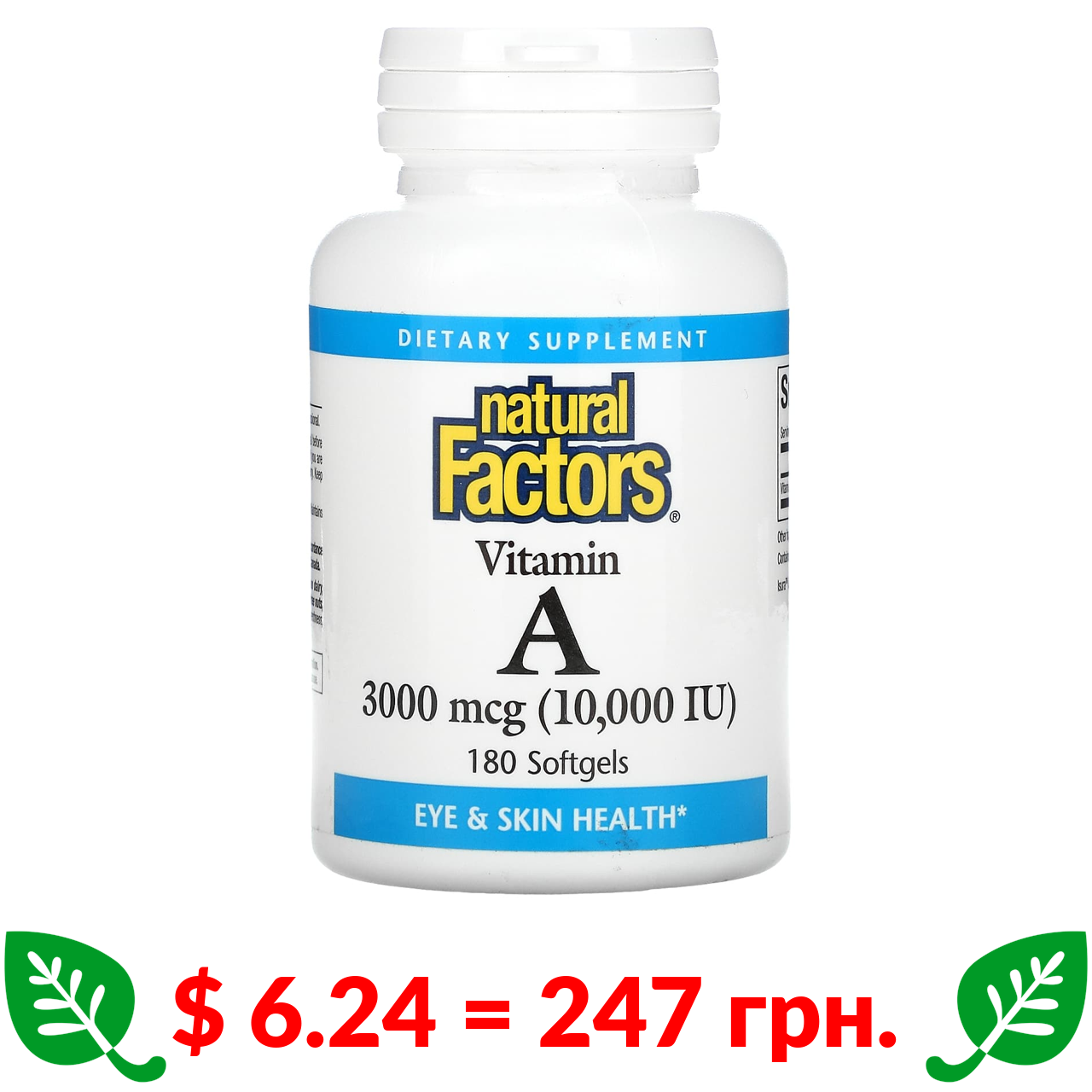$ 6.24 = 247 грн. Natural Factors, вітамін A, 3000 мкг (10 000 МО), 180 капсул