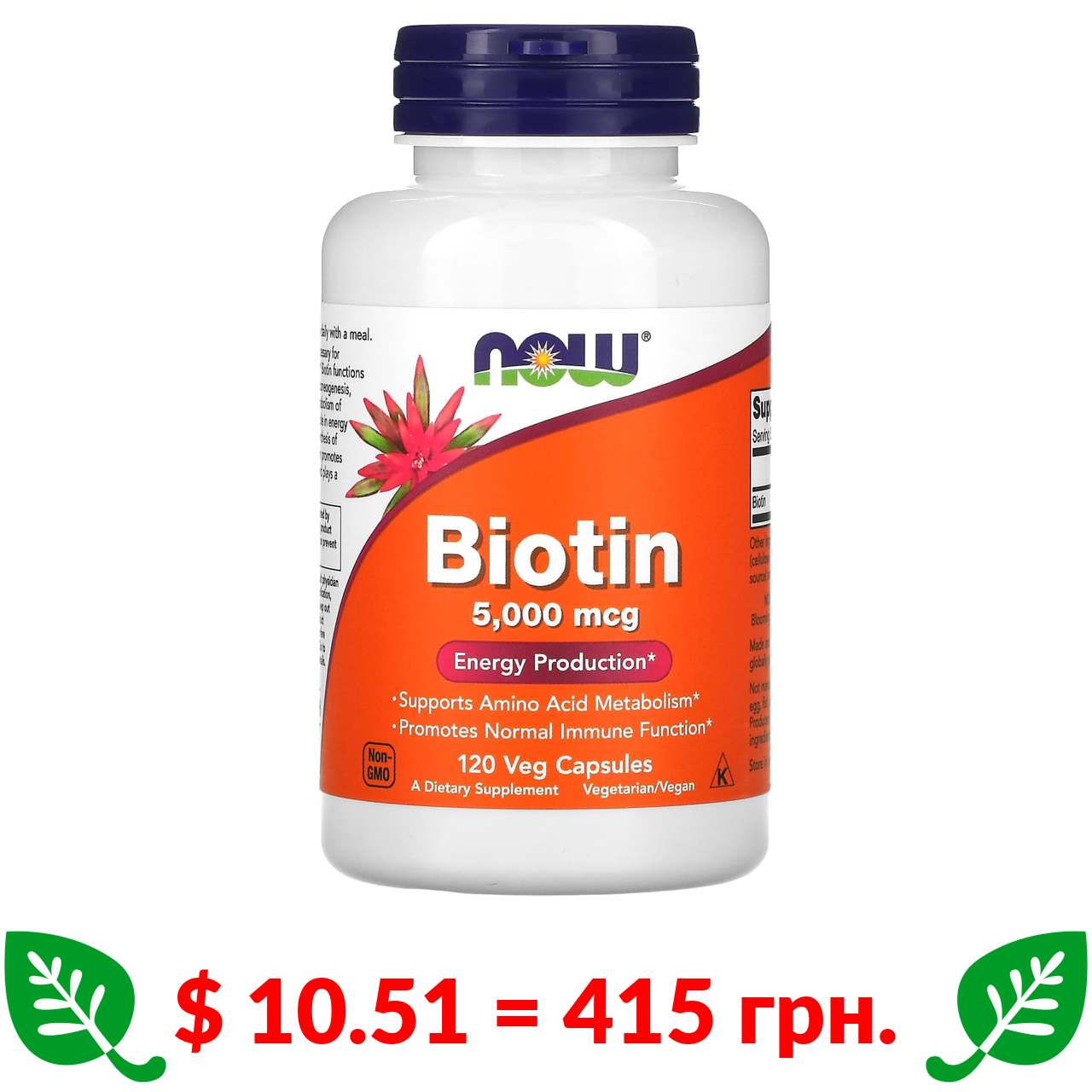 $ 10.51 = 415 грн. Now Foods, біотин, 5000 мкг, 120 вегетаріанських капсул