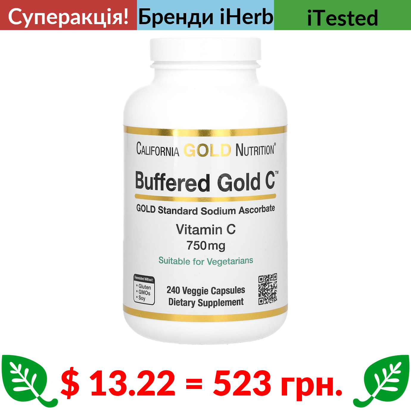 $ 13.22 = 523 грн. ???? cуперакція! ???? California Gold Nutrition, буферизовані капсули з вітаміном С, 750 мг, 240 вегетаріанських капсул
