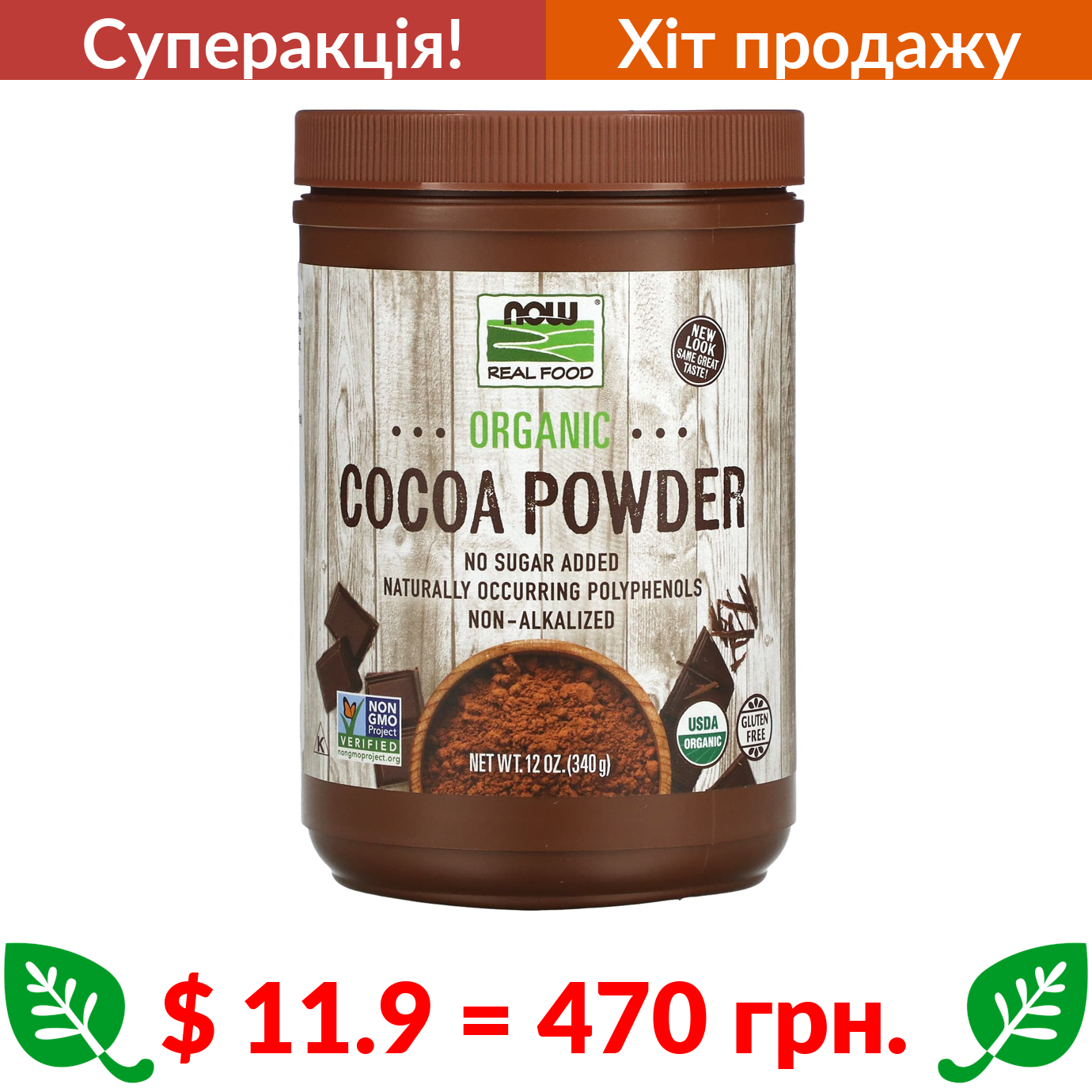 $ 11.9 = 470 грн. ???? cуперакція! ???? Now Foods, Real food, Cocoa Lovers, органічний порошок какао, 340 г (12 унцій)