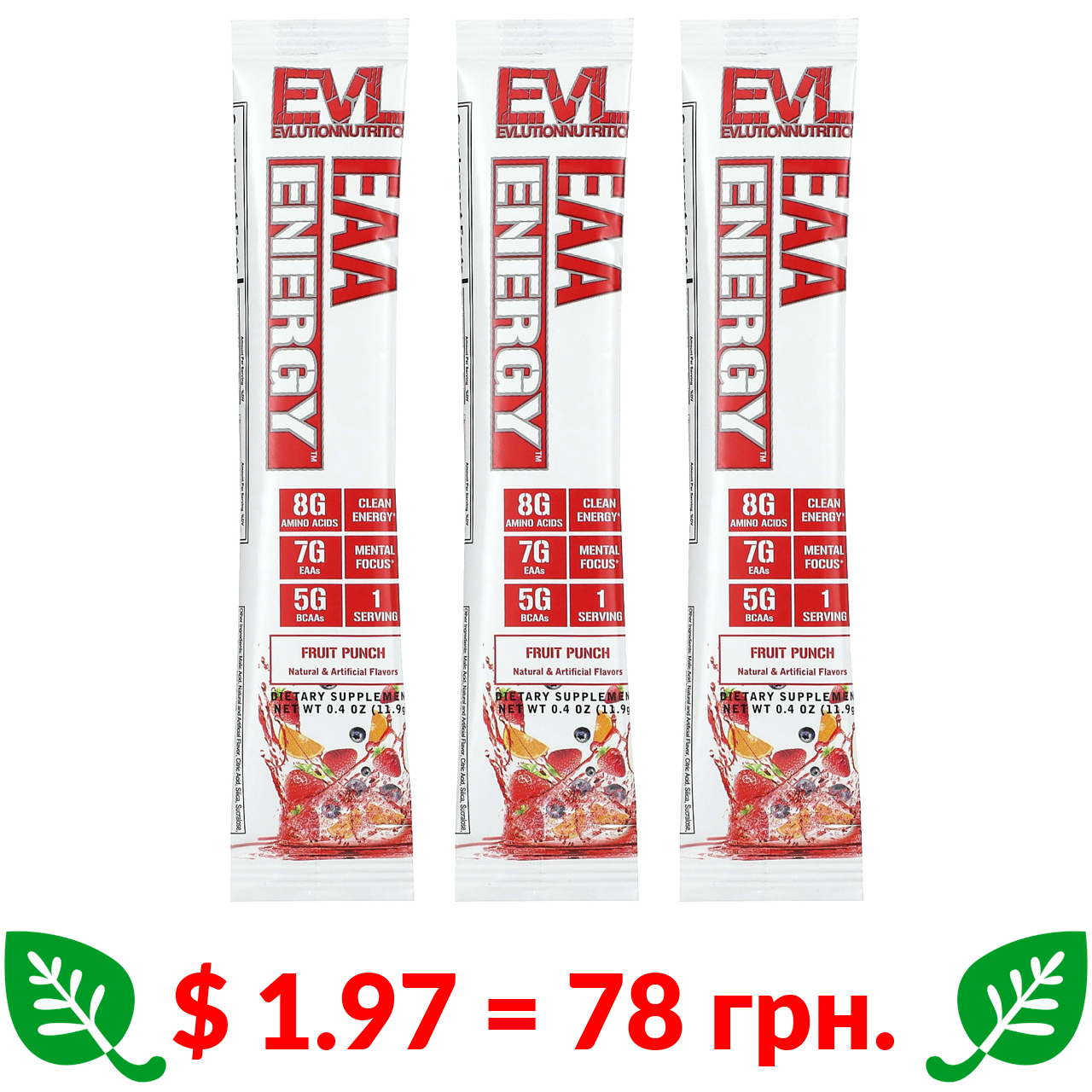 $ 1.97 = 78 грн. ????️ у кошику ????️ EVLution Nutrition, EAA Energy, Fruit Punch, 3 Sample Pack, 0.4 oz (11.9 g) Each