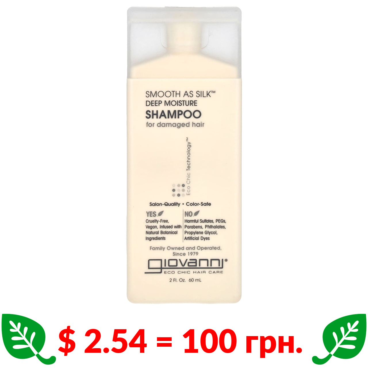 $ 2.54 = 100 грн. Giovanni, Smooth As Silk, інтенсивно зволожувальний шампунь, 60 мл (2 рідк. унції)