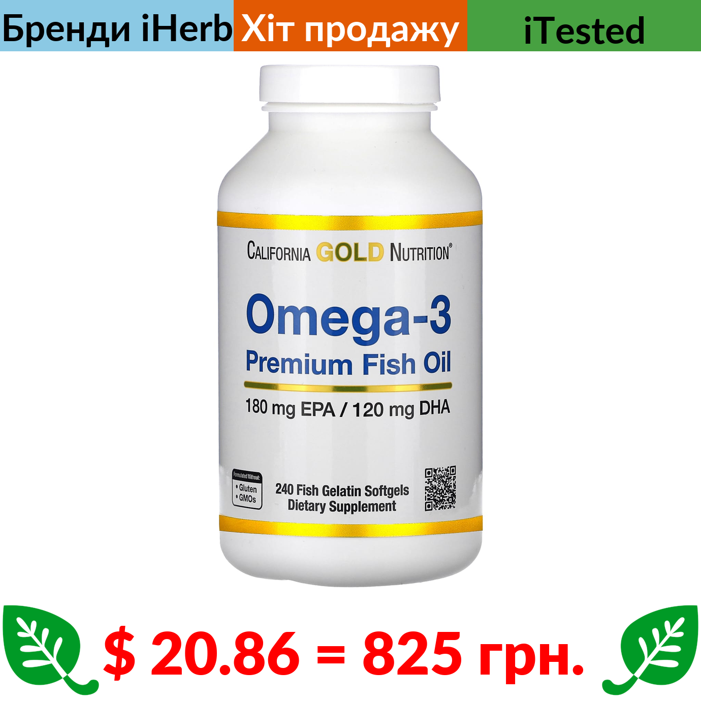 Лише $27.33 – Комбопропозиція (економія $5.0) купуйте разом з California Gold Nutrition, омега-3, риб’ячий жир преміальної якості, 240 риб’ячих желатинових капсул