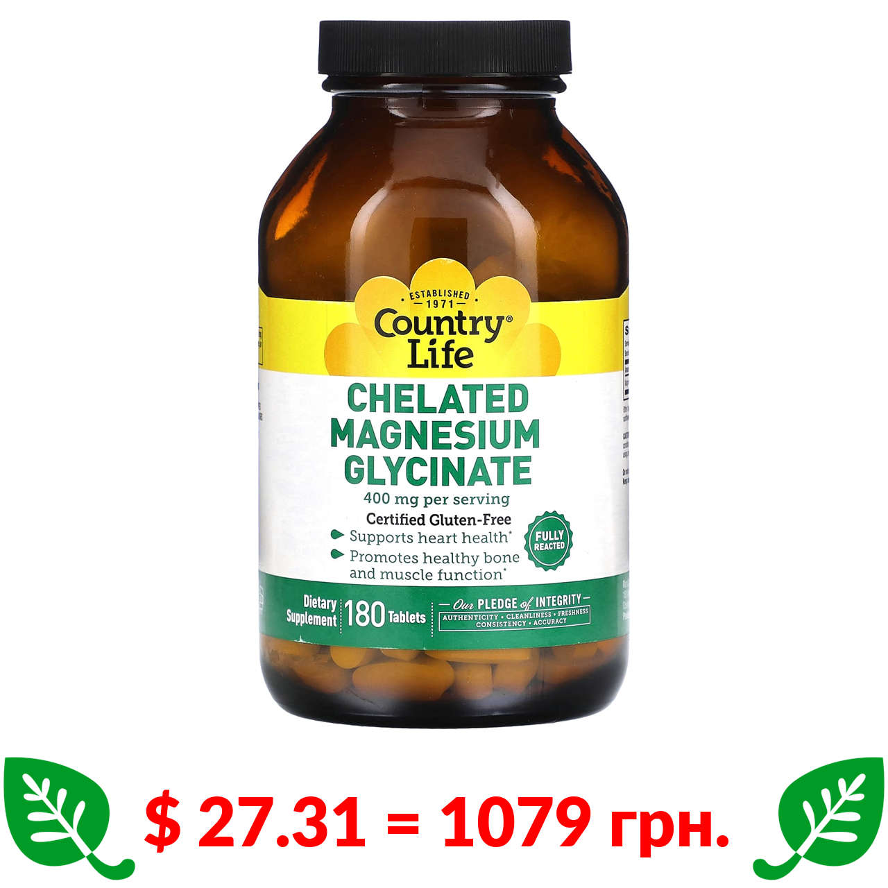 $ 27.31 = 1079 грн. Country Life, хелатний гліцинат магнію, 400 мг, 180 таблеток (133 мг у таблетці)