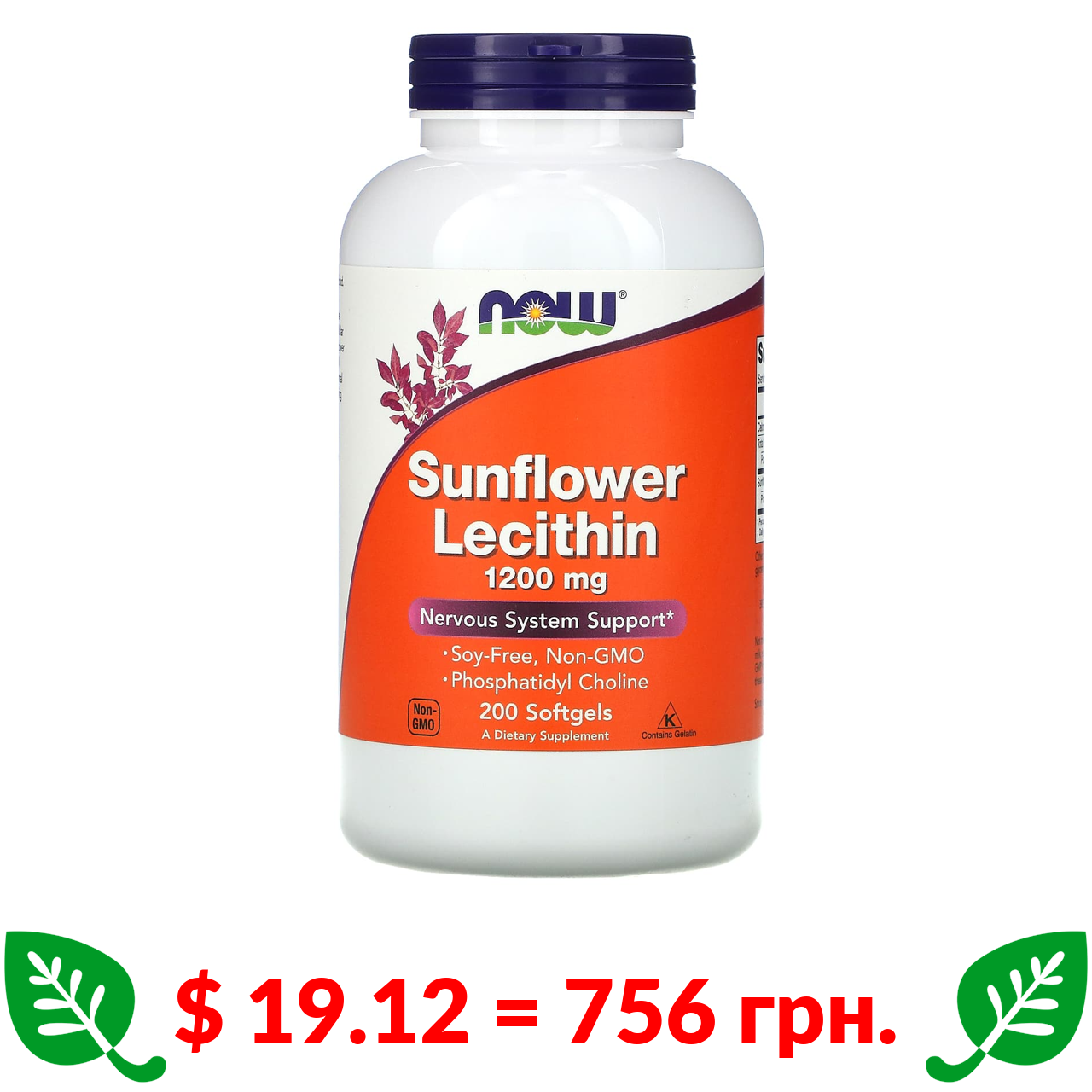 $ 19.12 = 756 грн. Now Foods, соняшниковий лецитин, 1200 мг, 200 м’яких таблеток