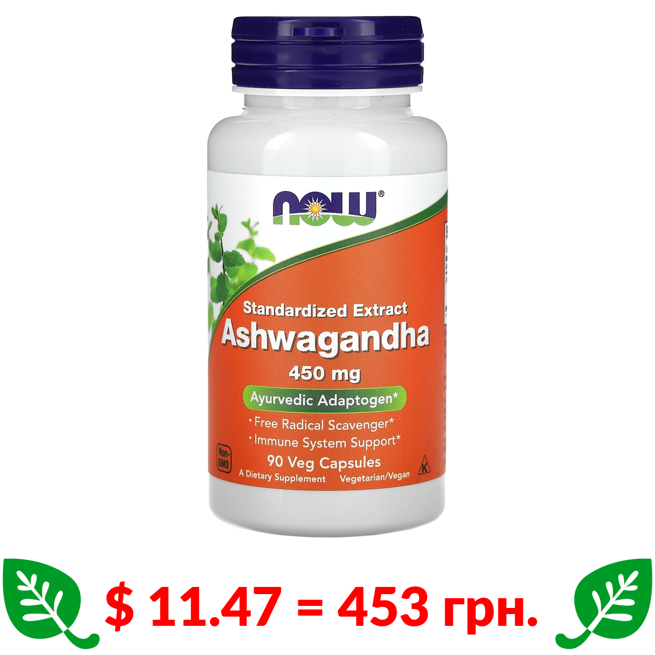 $ 11.47 = 453 грн. Now Foods, ашваганда, стандартизований екстракт, 450 мг, 90 вегетаріанських капсул