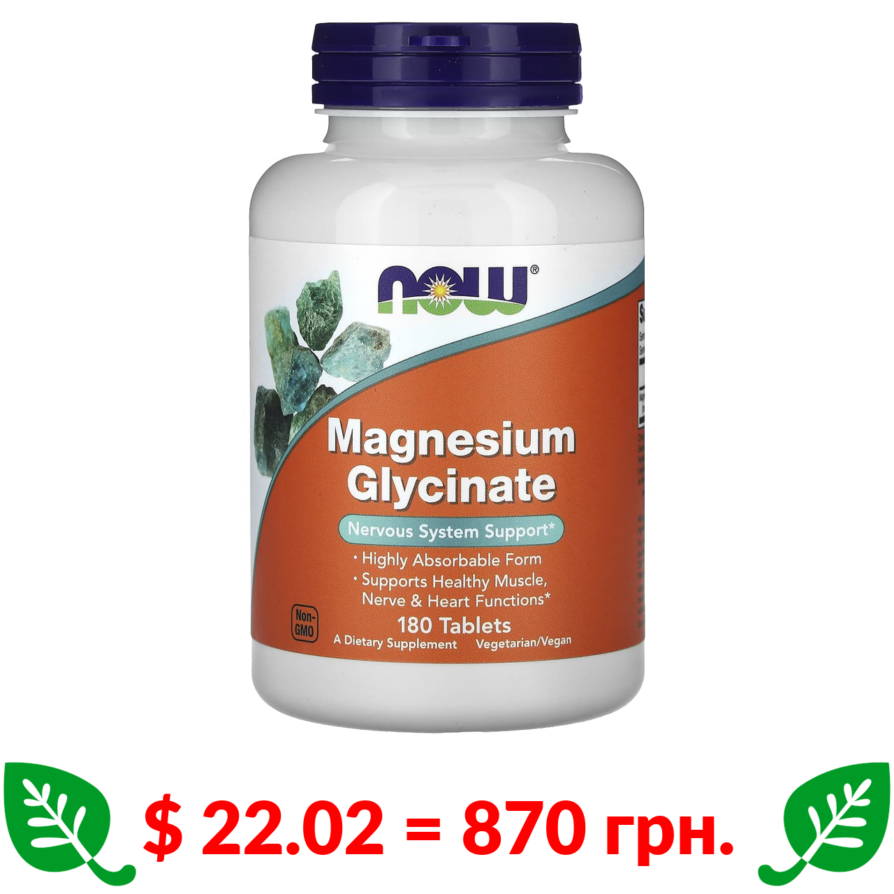 $ 22.02 = 870 грн. Now Foods, гліцинат магнію, 180 таблеток
