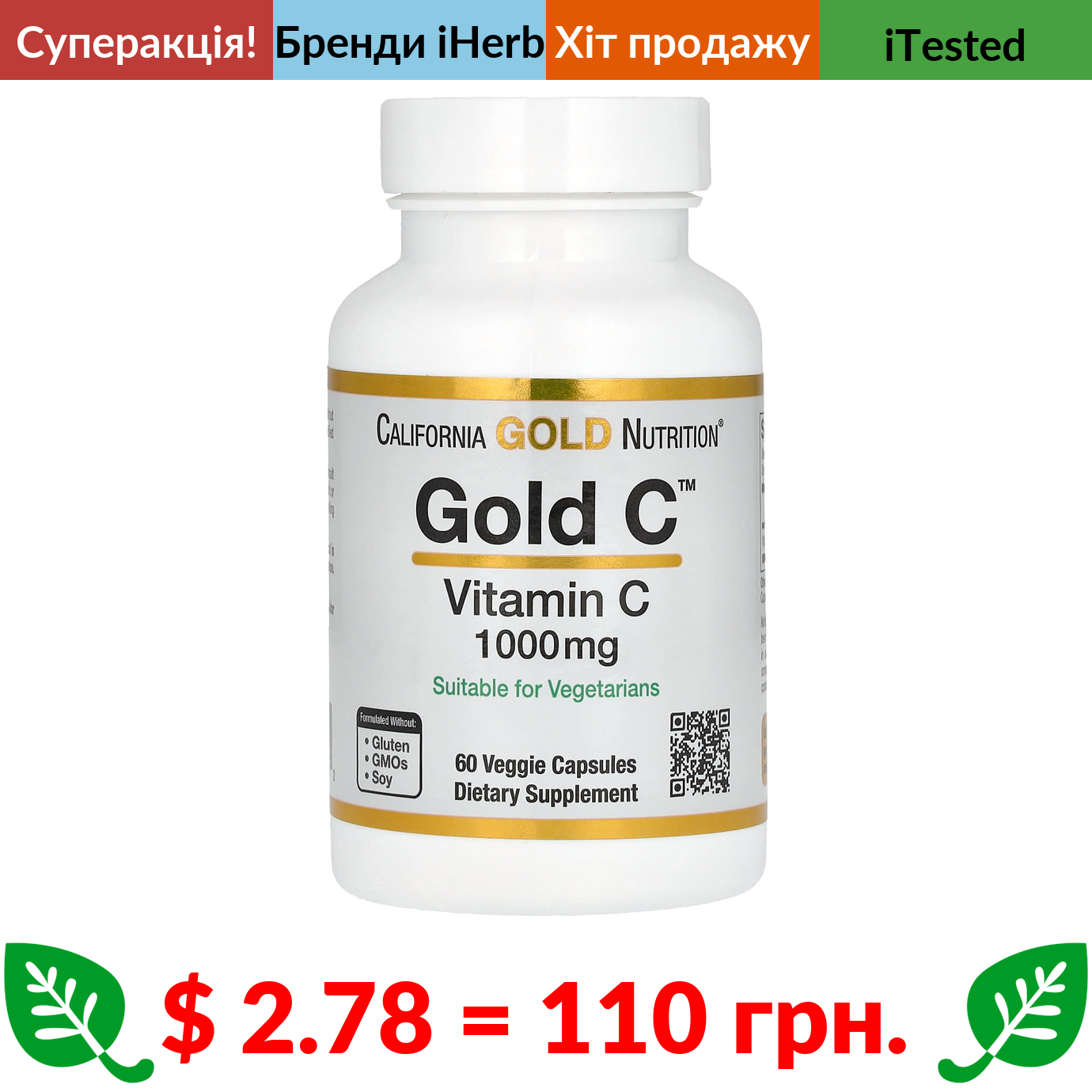 $ 2.78 = 110 грн. ???? cуперакція! ???? California Gold Nutrition, Gold C, вітамін С, 1000 мг, 60 вегетаріанських капсул