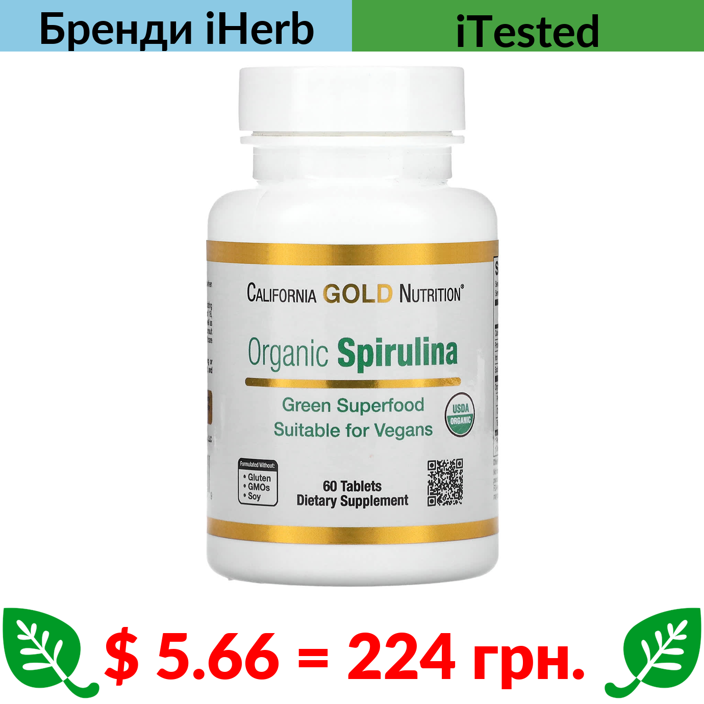 $ 5.66 = 224 грн. ????️ у кошику ????️ California Gold Nutrition, органічна спіруліна, 1500 мг, 60 таблеток (500 мг у таблетці)