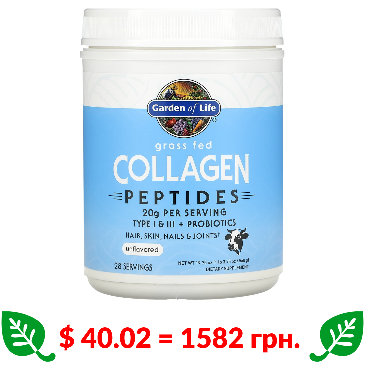 $ 40.02 = 1582 грн. Garden of Life, пептиди колагену з м’яса тварин трав’яного відгодовування, з нейтральним смаком, 560 г (19,75 унцій)