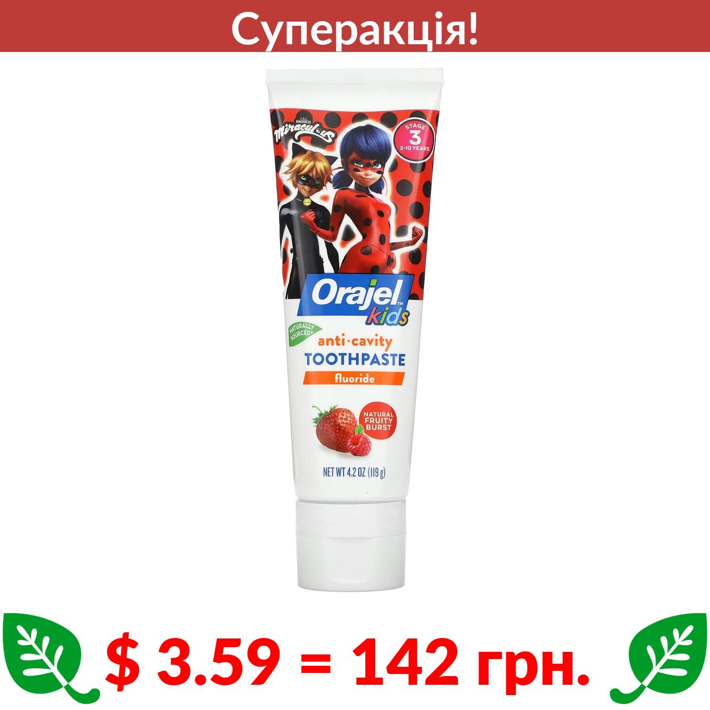 $ 3.59 = 142 грн. ???? cуперакція! ???? Orajel, Kids, Miraculous Anticavity Fluoride Toothpaste, 2-10 Years, Natural Fruity Burst, 4.2 oz (119 g)