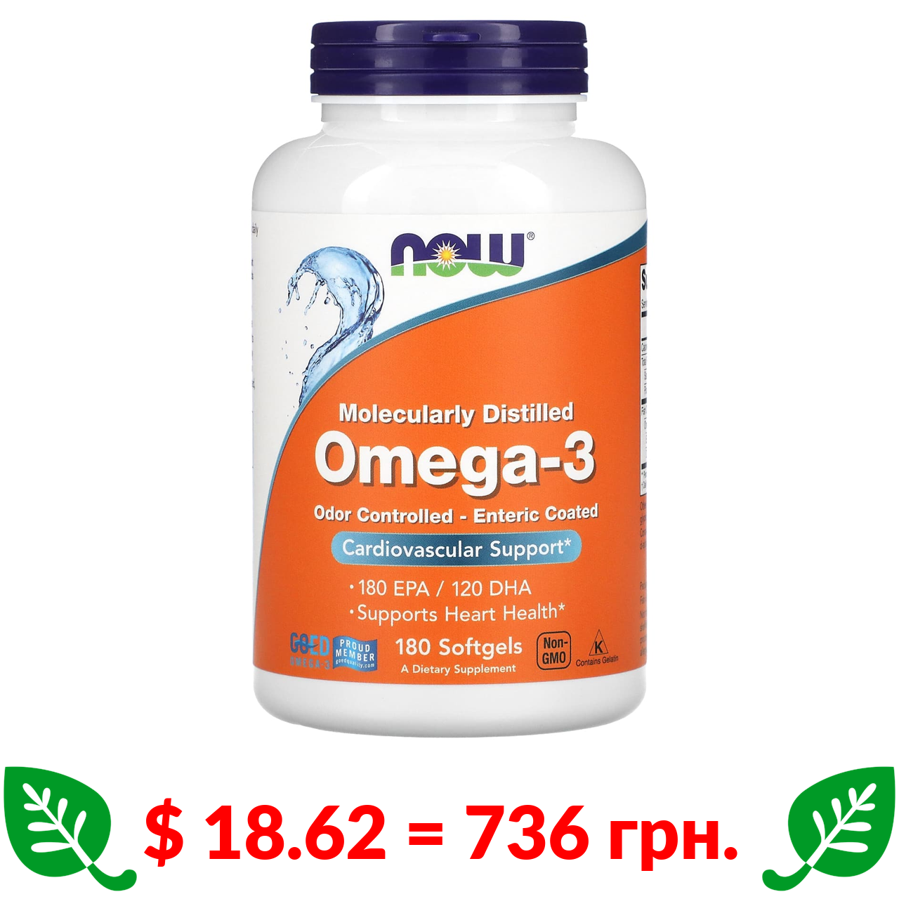 $ 18.62 = 736 грн. Now Foods, омега-3, 180 мг ЕПК / 120 мг ДГК, 180 капсул, вкритих кишковорозчинною оболонкою