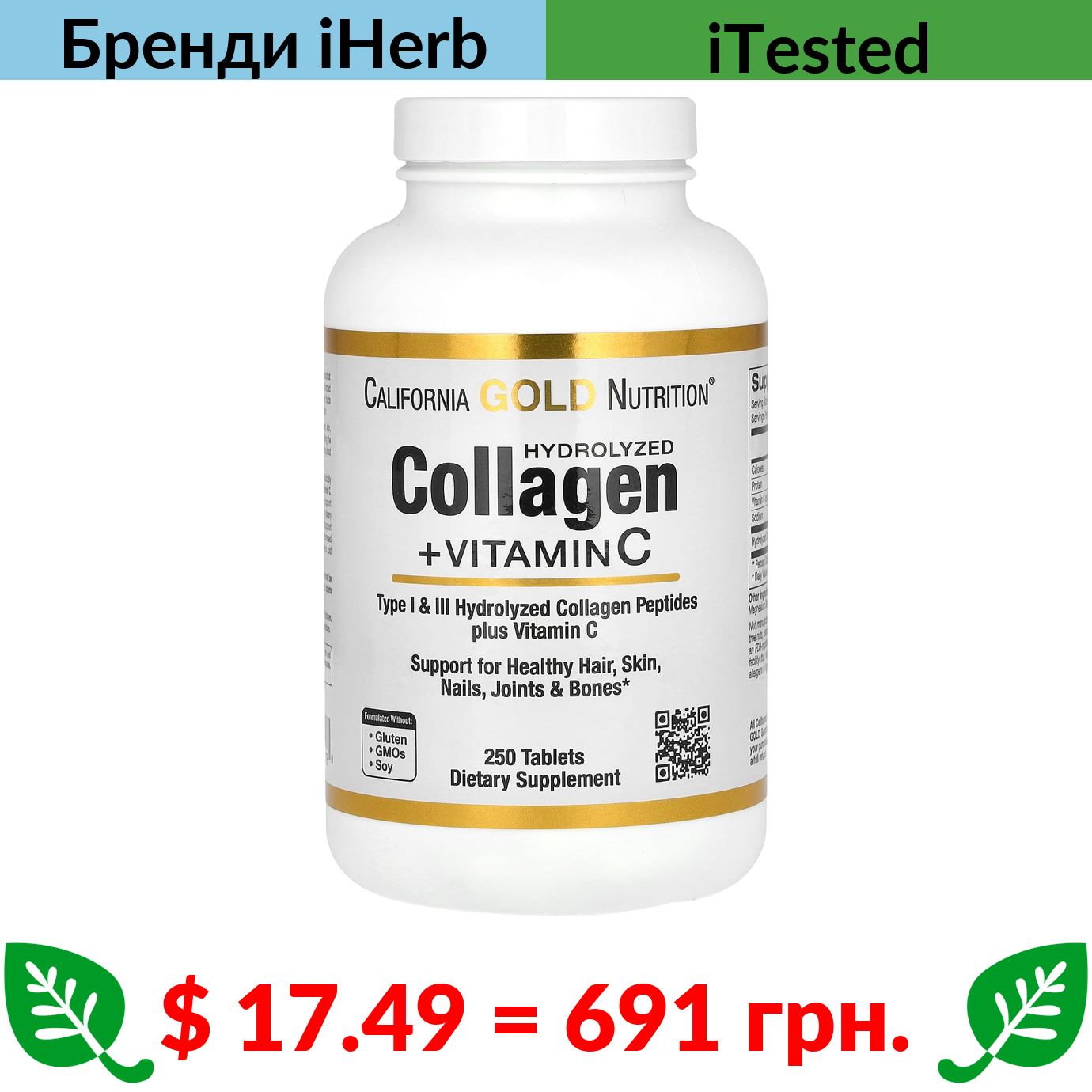 $ 17.49 = 691 грн. ????️ у кошику ????️ California Gold Nutrition, пептиди гідролізованого колагену типів 1 та 3, 250 плюс вітамін С, 250 таблеток