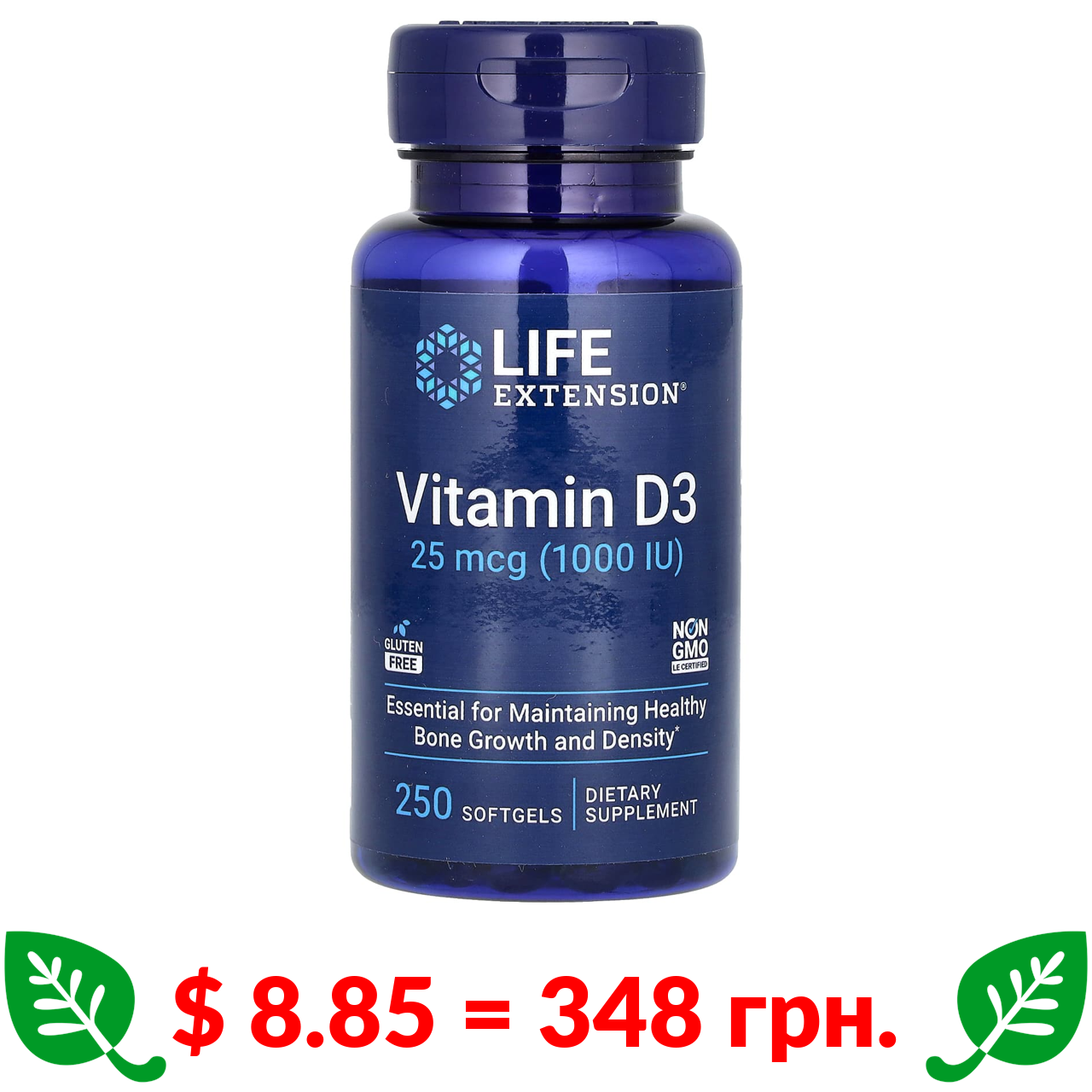$ 8.85 = 348 грн. Life Extension, вітамін D3, 25 мкг (1000 МО), 250 капсул