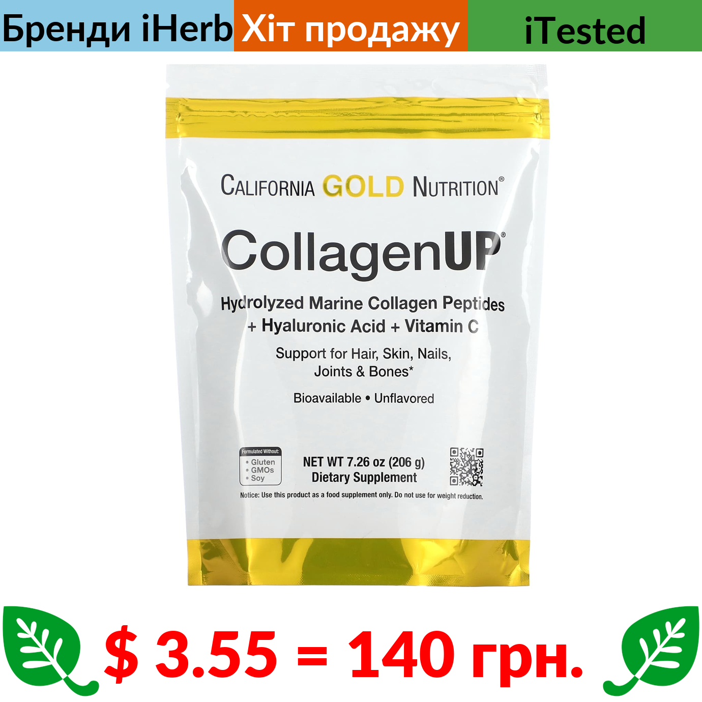 $ 3.55 = 140 грн. California Gold Nutrition, CollagenUP, пептиди гідролізованого морського колагену з гіалуроновою кислотою та вітаміном C, без добавок, 206 г (7,26 фунта)