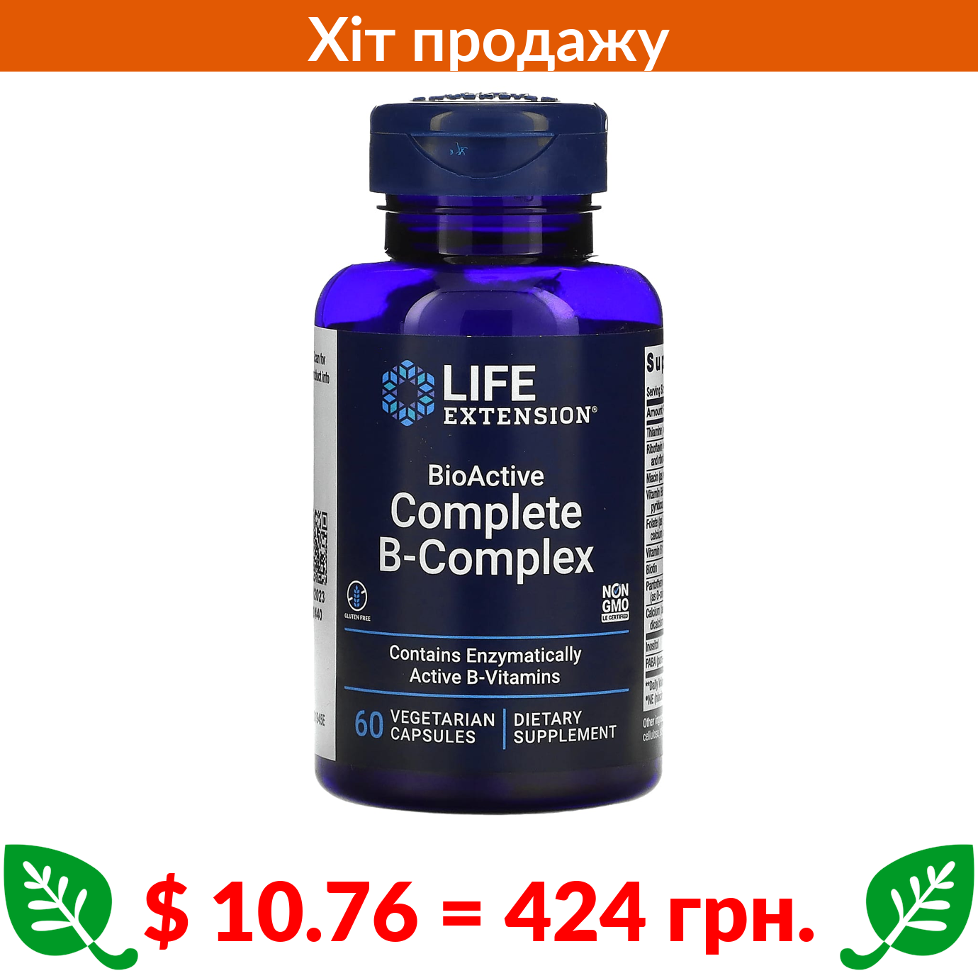 $ 10.76 = 424 грн. Life Extension, повний комплекс біоактивних вітамінів групи B, 60 вегетаріанських капсул