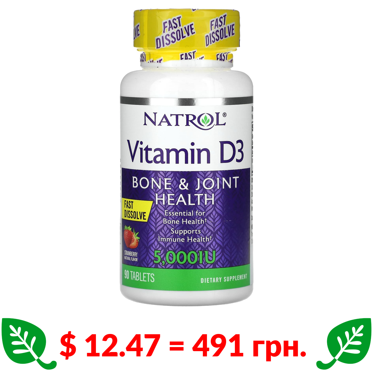 $ 12.47 = 491 грн. Natrol, Vitamin D3, Bone & Joint Health, Strawberry Natural Flavor, 5,000 IU, 90 Tablets