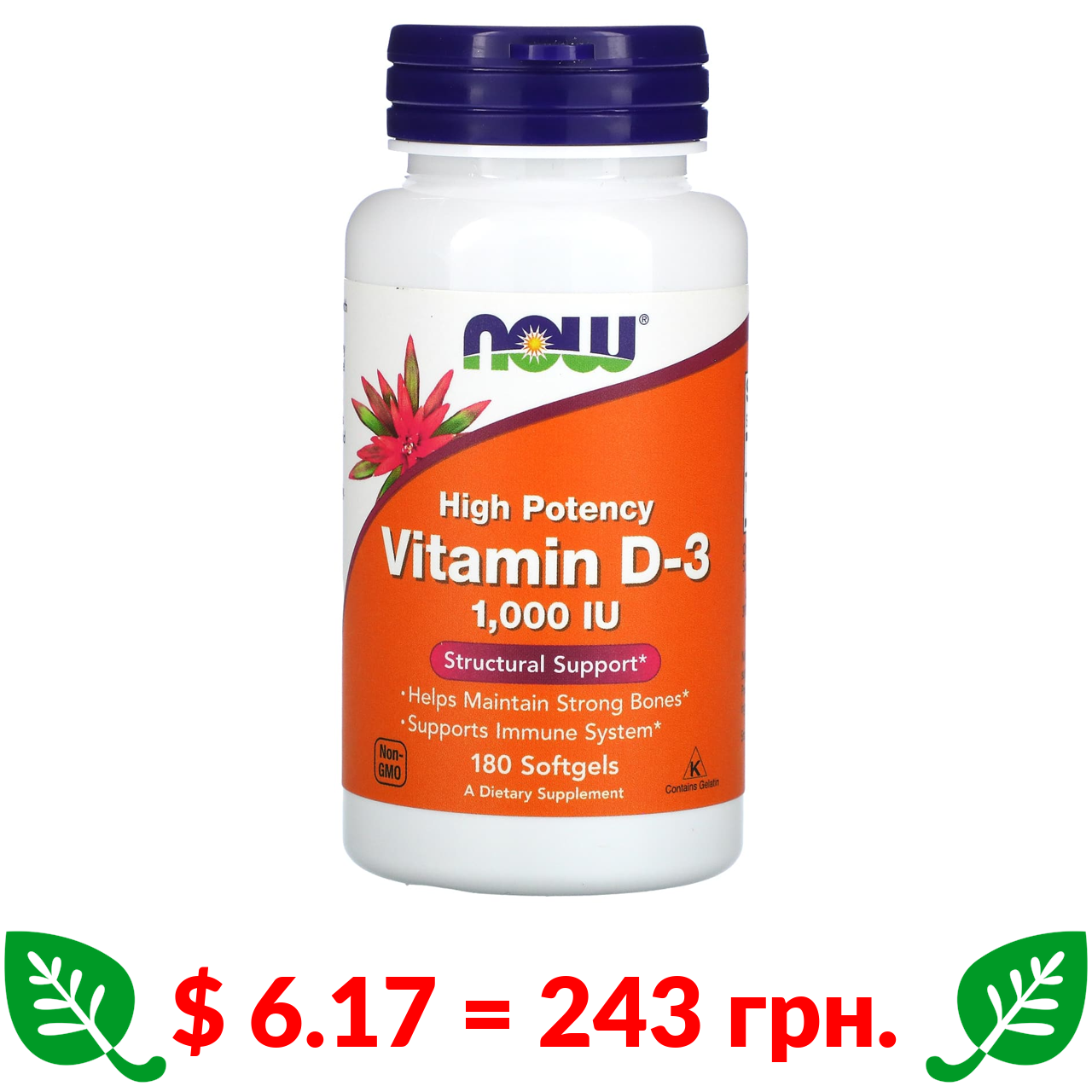 $ 6.17 = 243 грн. Now Foods, високоефективний вітамін D3, 1000 МО, 180 капсул