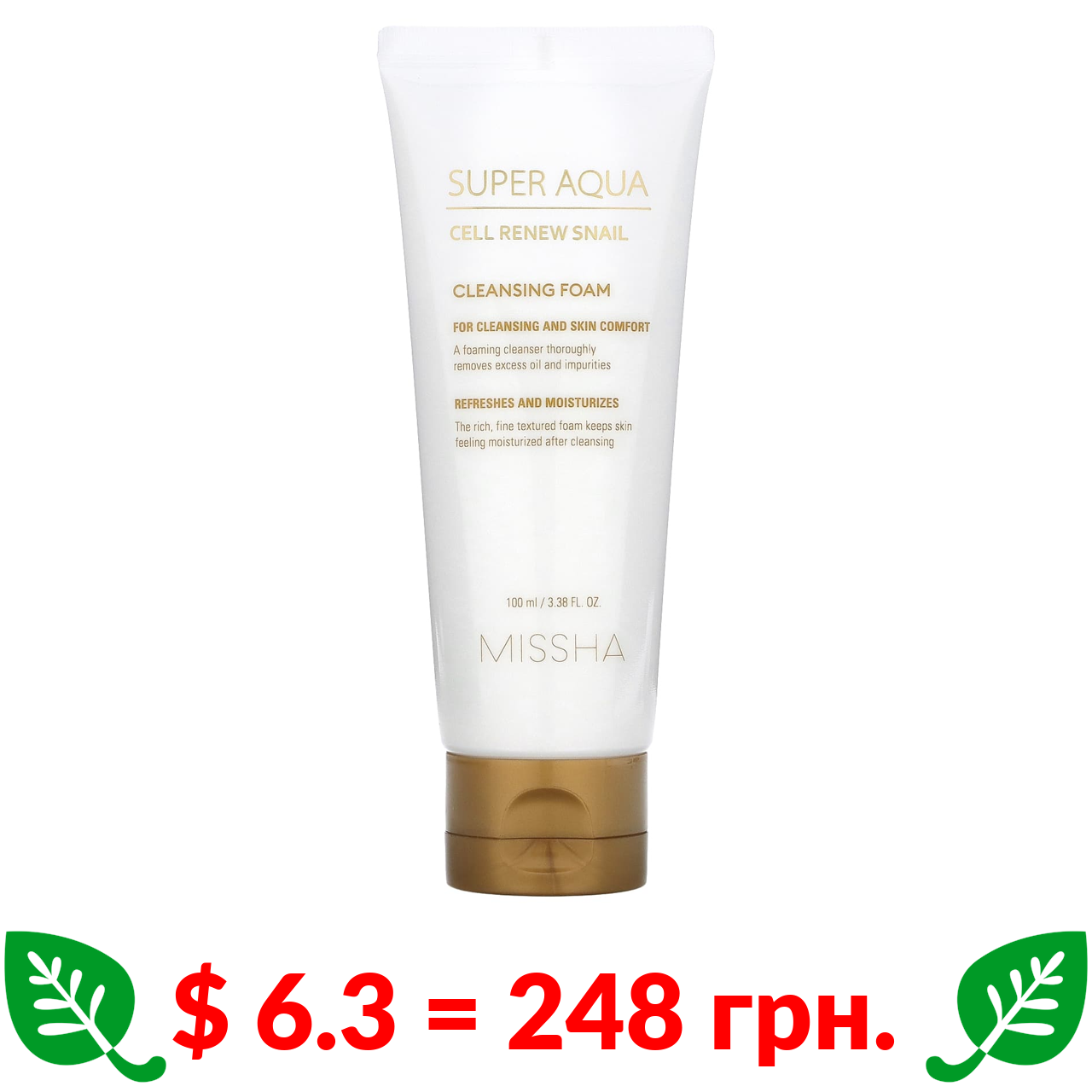 $ 6.3 = 248 грн. Missha, Super Aqua, очищувальна пінка з екстрактом муцину равликів для відновлення клітин шкіри, 100 мл (3,38 рідк. унції)