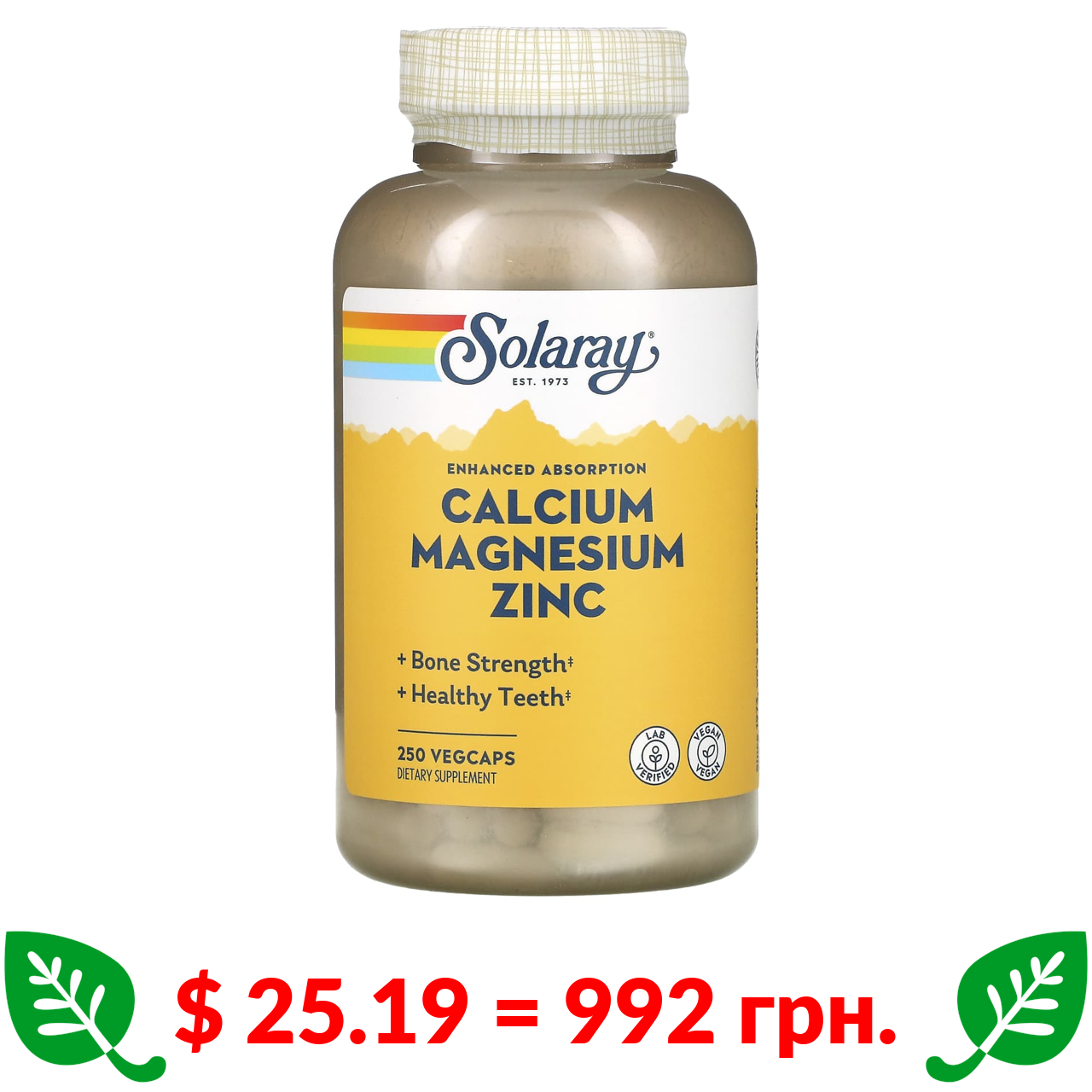 $ 25.19 = 992 грн. Solaray, кальцій, магній, цинк, 250 вегетаріанських таблеток