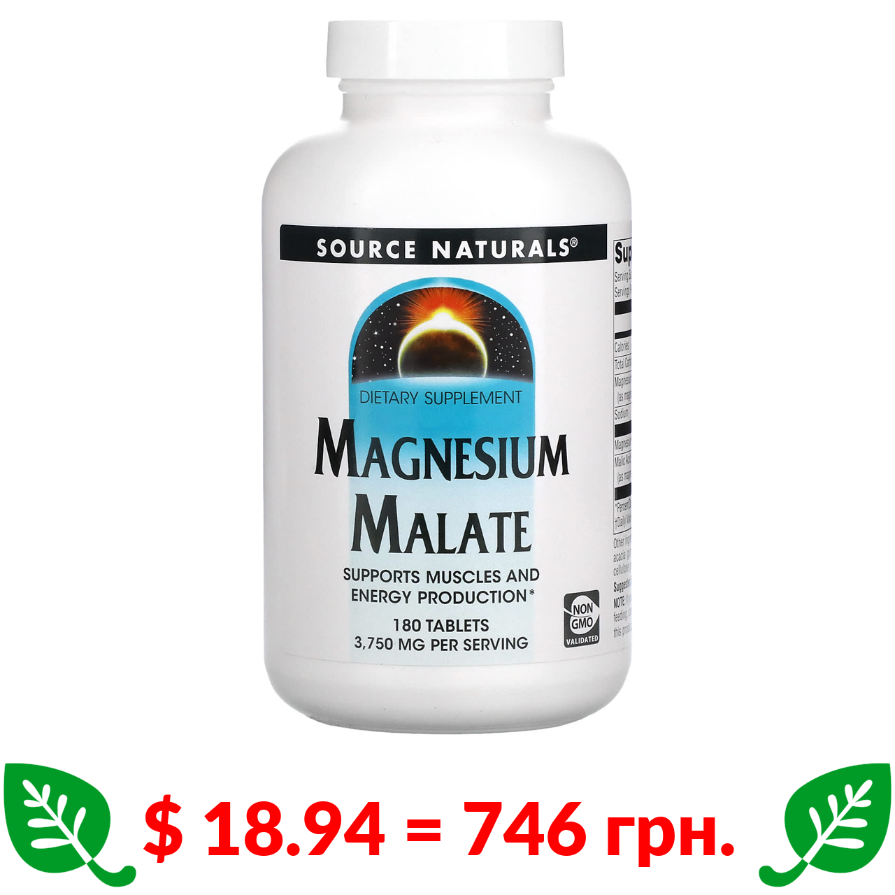 $ 18.94 = 746 грн. Source Naturals, малат магнію, 3750 мг, 180 таблеток (1250 мг у таблетці)