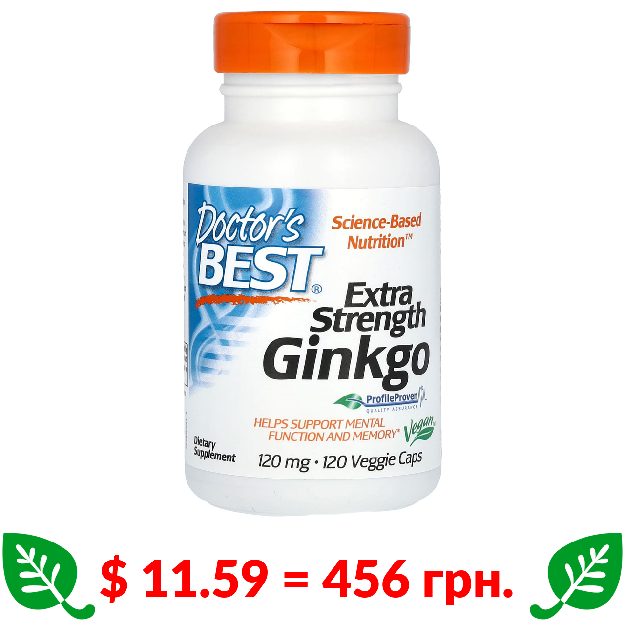 $ 11.59 = 456 грн. Doctor’s Best, гінкго білоба з підвищеною силою дії, 120 мг, 120 вегетаріанських капсул