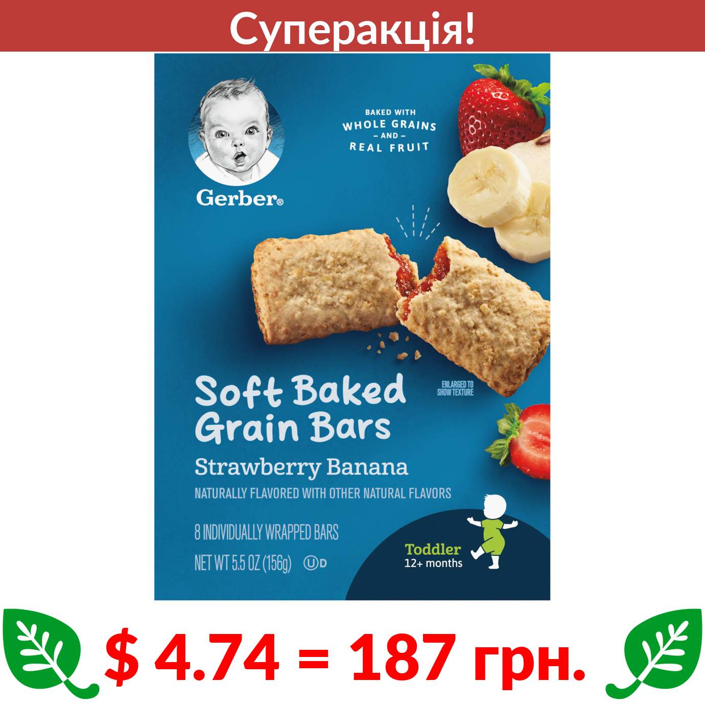 $ 4.74 = 187 грн. ???? cуперакція! ???? Gerber, м’які запечені зернові батончики, для малюків від 12 місяців, полуниця й банан, 8 батончиків, 156 г (5,5 унцій)