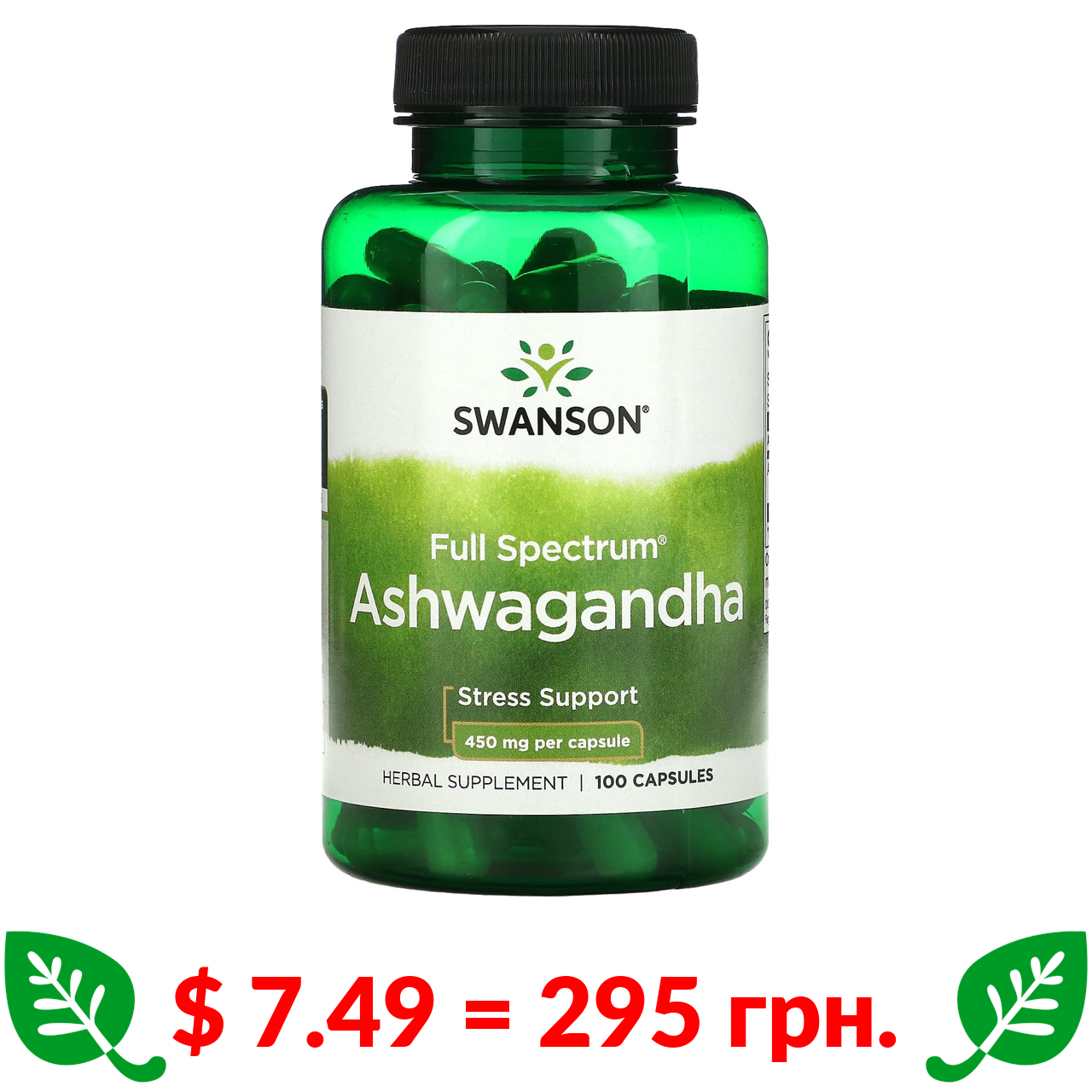 $ 7.49 = 295 грн. Swanson, ашваганда, 450 мг, 100 капсул