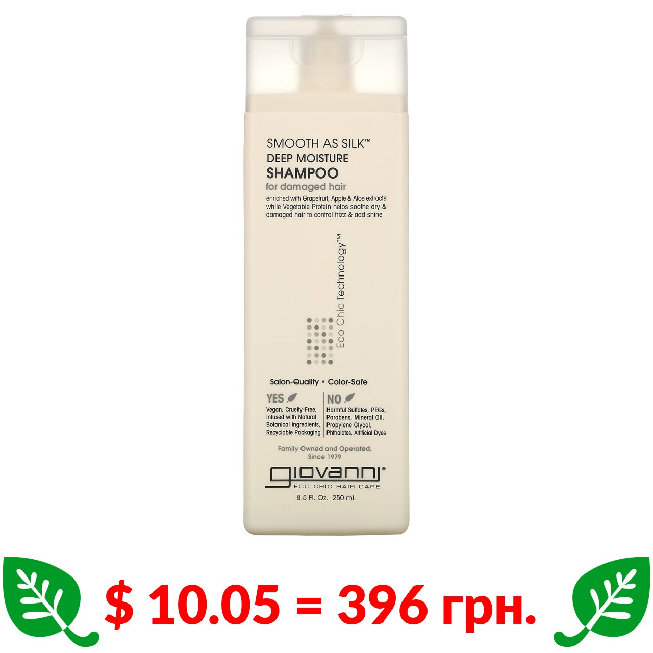 $ 10.05 = 396 грн. Giovanni, Smooth As Silk, інтенсивно зволожувальний шампунь, для пошкодженого волосся, 250 мл (8.5 рідк. унції)