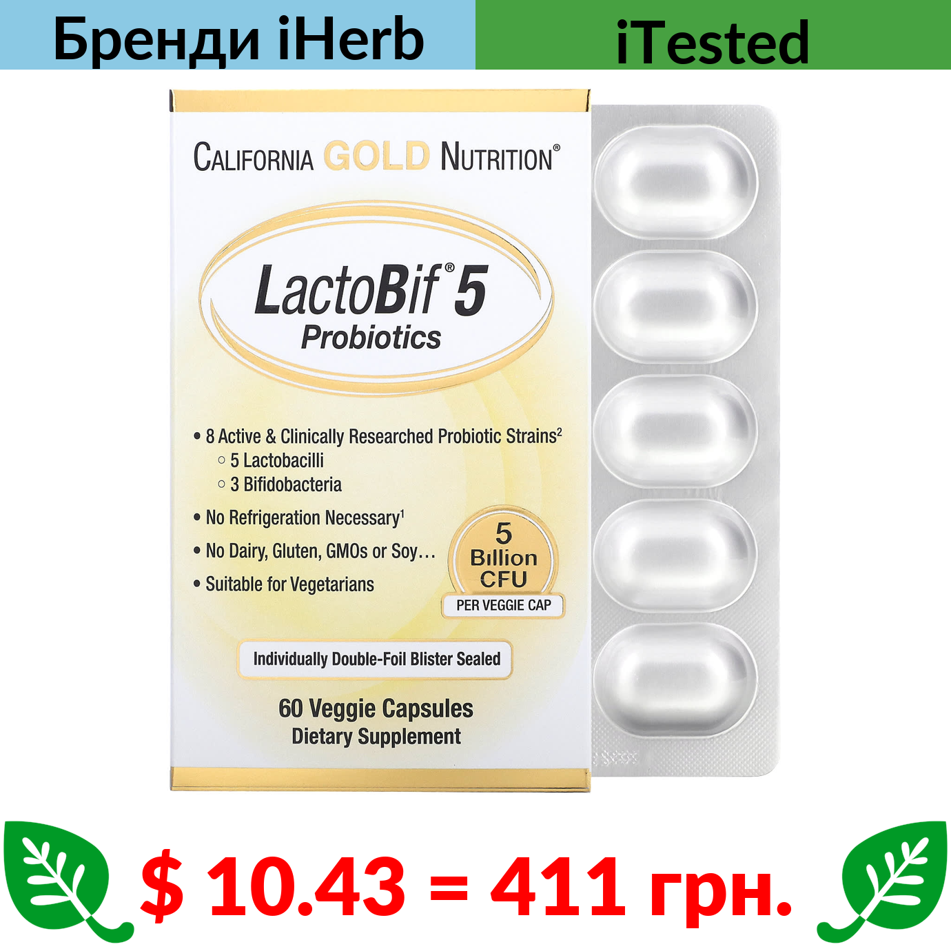 $ 10.43 = 411 грн. California Gold Nutrition, LactoBif, пробіотики, 5 млрд КУО, 60 вегетаріанських капсул
