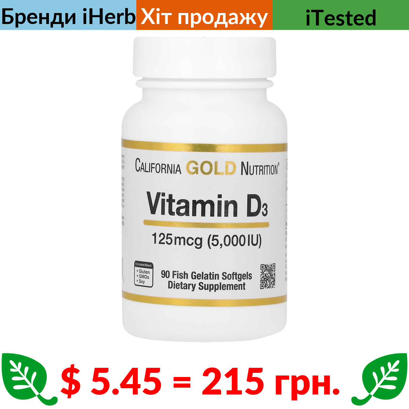 $ 5.45 = 215 грн. California Gold Nutrition, вітамін D3, 125 мг (5000 МО), 90 капсул з риб’ячого желатину