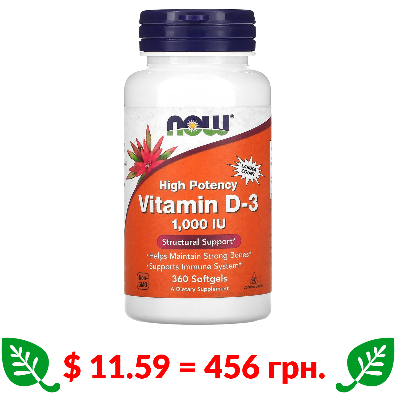 $ 11.59 = 456 грн. Now Foods, високоефективний вітамін D3, 25 мкг (1000 МО), 360 капсул