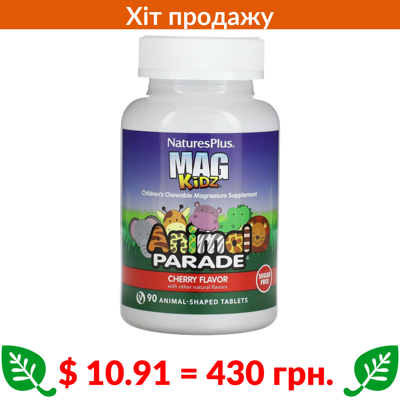 $ 10.91 = 430 грн. Nature’s Plus, MagKidz, Animal Parade, жувальні таблетки з магнієм для дітей, вишня, 90 таблеток у формі тварин