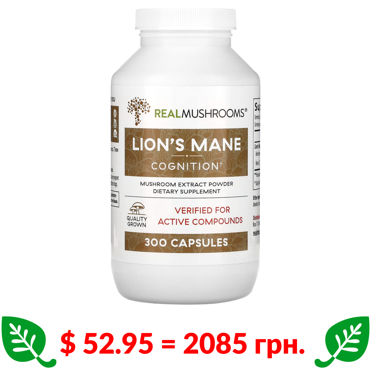 $ 52.95 = 2085 грн. Real Mushrooms, їжовик гребінчастий, підтримка когнітивних функцій, 300 капсул