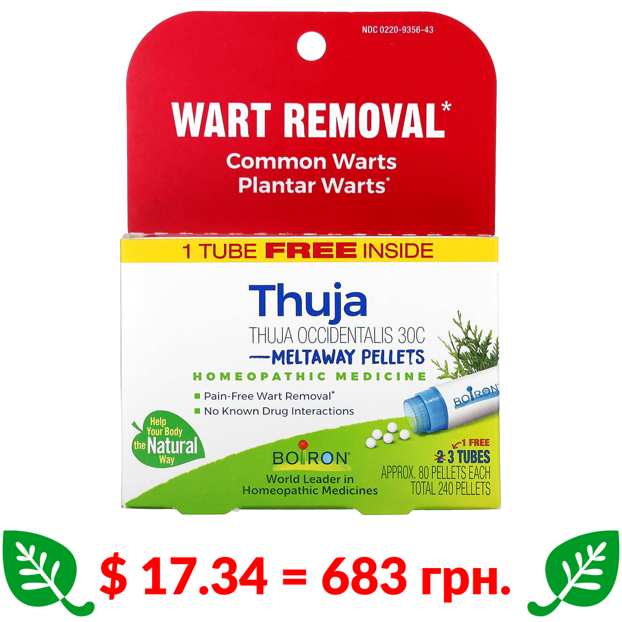 $ 17.34 = 683 грн. Boiron, Thuja Occidentalis, 30 °C, 3 туби, приблизно по 80 гранул в кожній
