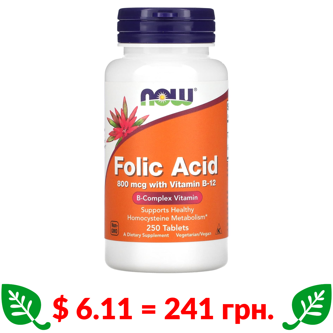 $ 6.11 = 241 грн. Now Foods, фолієва кислота, 800 мкг, 250 таблеток